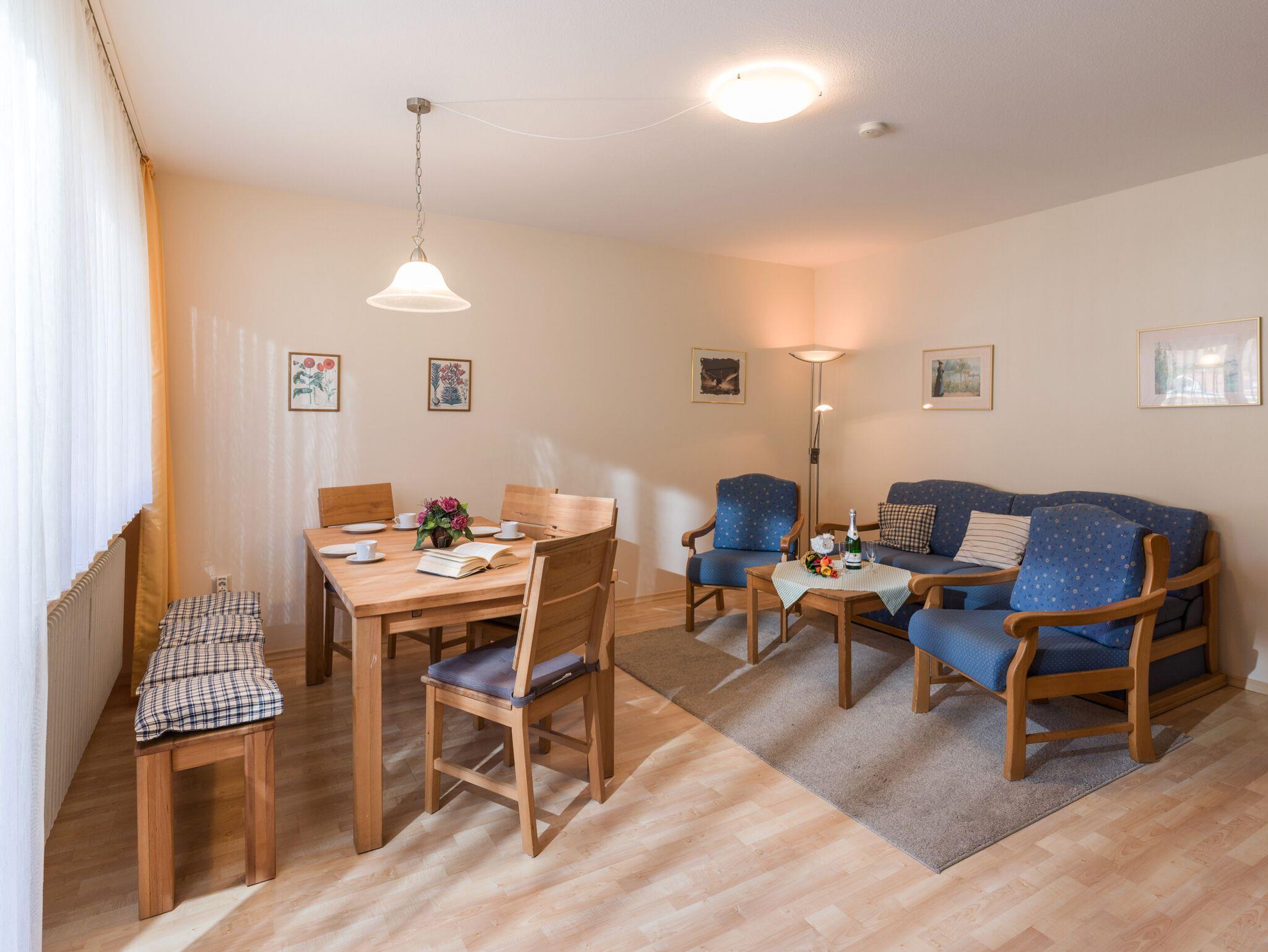 Freundlich eingerichtete Ferienwohnung im Erdgeschoss mit separater Küche, Bad mit Badewanne, Schlafzimmer mit einem Doppelbett und einem Einzelbett , einem hellen Wohnraum mit gemütlicher Essecke. Platz genug für 2 oder mehr Erwachsene oder einer kleinen Familie. Das Wohnzimmer ist mit einer Ausziehcouch für 2 Personen und einem Esstisch für 5 Personen ausgestattet. Der Balkon lädt nach einem ereignisreichen Tag zum Sitzen im Freien ein. Die Küche verfügt über einen Backofen, Kühlschrank und einen 4- Plattenherd, sowie Kaffeemaschine, Toaster, Wasserkocher und Küchenutensilien. Die Wohnung liegt in einer familienfreundlichen Anlage mit Spielplatz, Ruheinseln im Garten und einem Hallenbad in ruhiger Lage am Tor zu den Alpen.