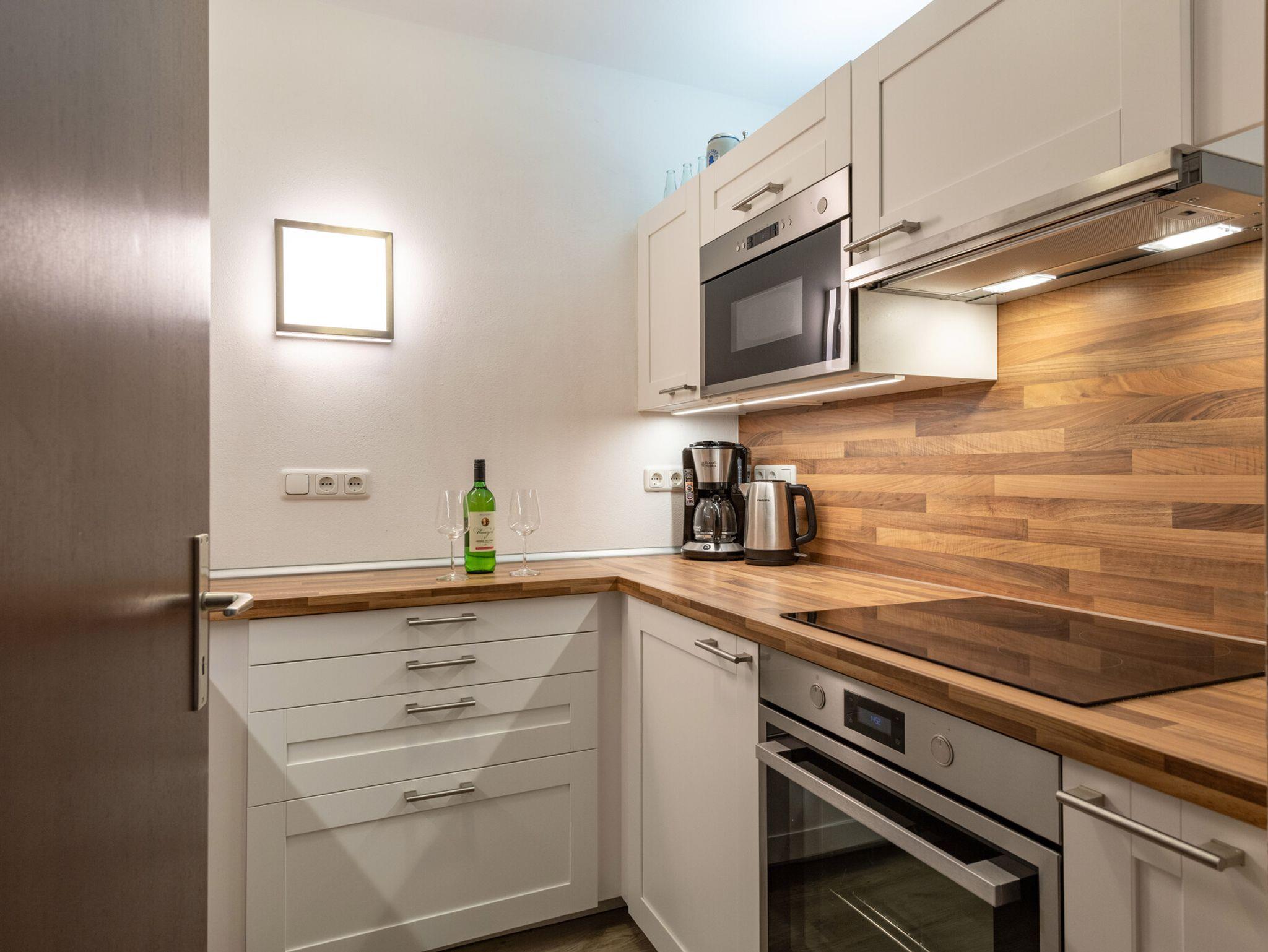 Die Wohnung ist ausgestattet mit Wlan. Zur Verfügung stehen im Keller gegen eine geringe Gebühr eine Waschmaschine und ein Trockner.