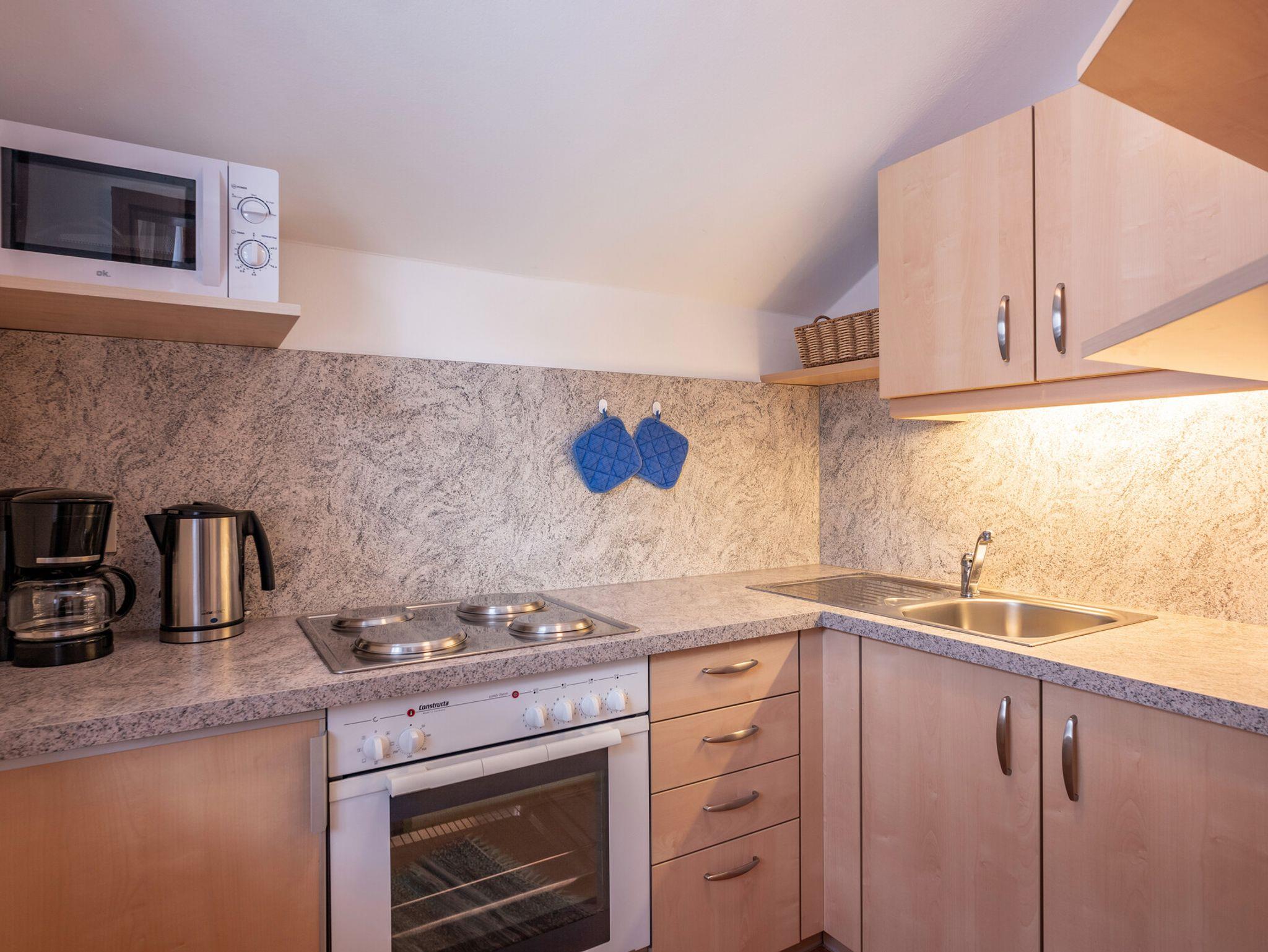 Gemütliche Zweizimmerwohnungen mit Blick nach Süden auf das Kaisergebirge (56 qm, 2 bis 4 Personen) und einer Schlafcouch. Wohnzimmer mit Eckbank und Fernseher. Schlafzimmer mit Doppelbett und Kleiderschrank. Bad mit WC und Wanne. Küche mit 4 Plattenherd, Backofen, Kühlschrank, Mikrowelle, Kaffeemaschine und Toaster. Nach einem ereignisreichen Tag lädt der Balkon zum Entspannen ein. Handtücher und Bettwäsche sind vorhanden. Zur Wohnung gehört eine Tiefgarage.