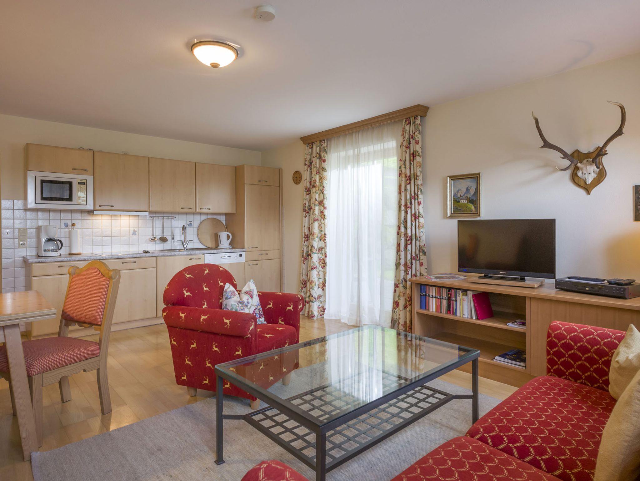 Die Ferienwohnung im Erdgeschoss hat ein Schlafzimmer (mit Doppelbett), ein Bad mit Dusche und WC und den Wohnraum mit Essecke, Couch und Kochzeile mit Elektroherd und Spülmaschine. Die Wohnung hat einen Flatscreen-TV und WLAN. Vom Wohnraum kommen Sie auf die Terrasse mit Gartenmöbeln und Blick auf die Berge.