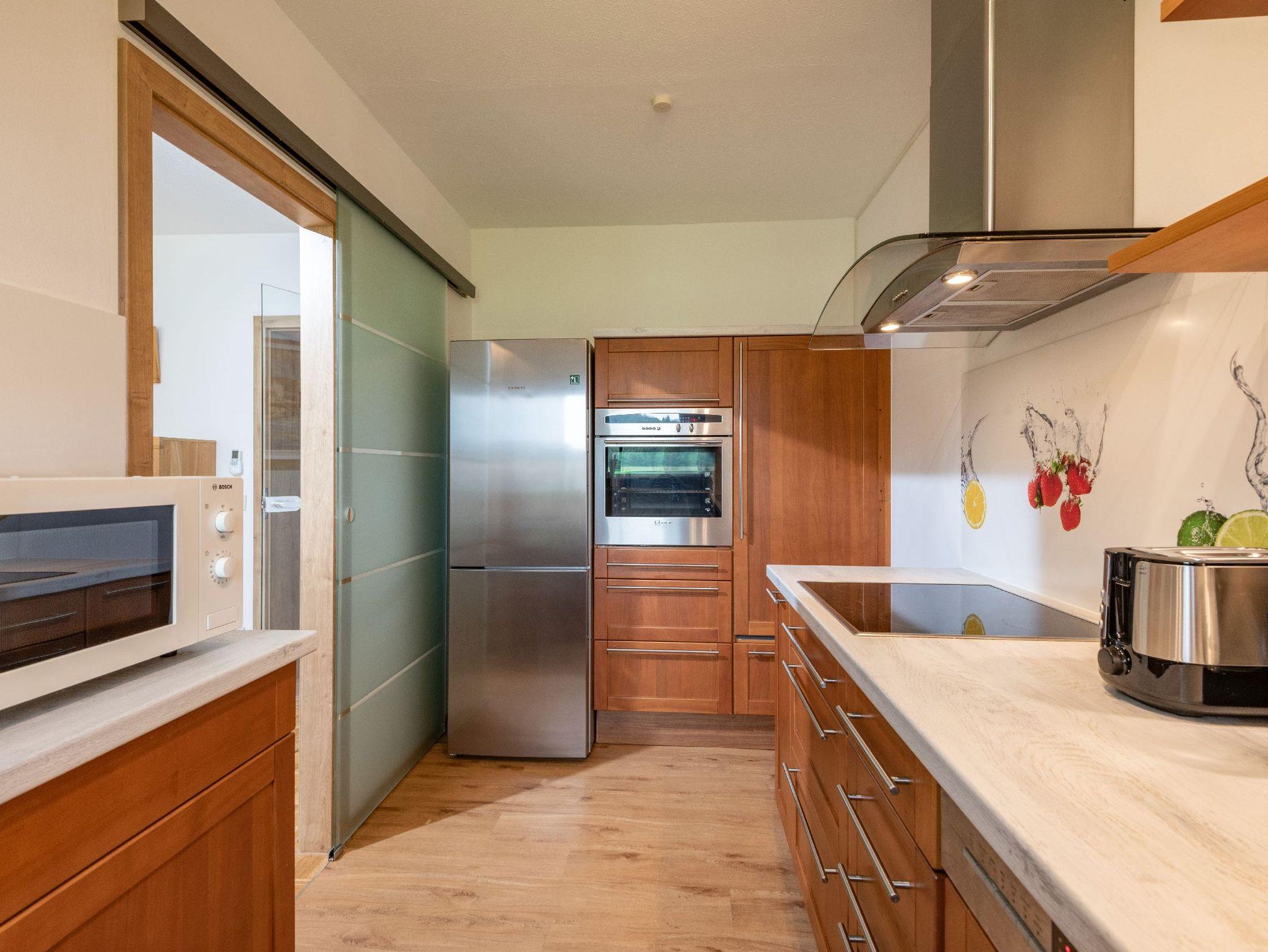 Die Ferienwohnung Panoramablick im Erdgeschoss ist 75m qm groß und bietet eine hervorragend ausgestatte Küche mit Geschirrspüler sowie Waschmaschine und Trockner, ein großzügiges Schlafzimmer, ein Badezimmer mit Dusche sowie ein gemütliches Wohnzimmer mit Essecke. Eine geräumige Terrasse mit freiem Blick auf das Ortszentrum sowie Bergblick auf das Kaisergebirge lädt zum Genießen ein. In der Wohnung ist kostenloses Wlan verfügbar. Vor der Unterkunft finden Sie eine kostenfreie Parkmöglichkeit.