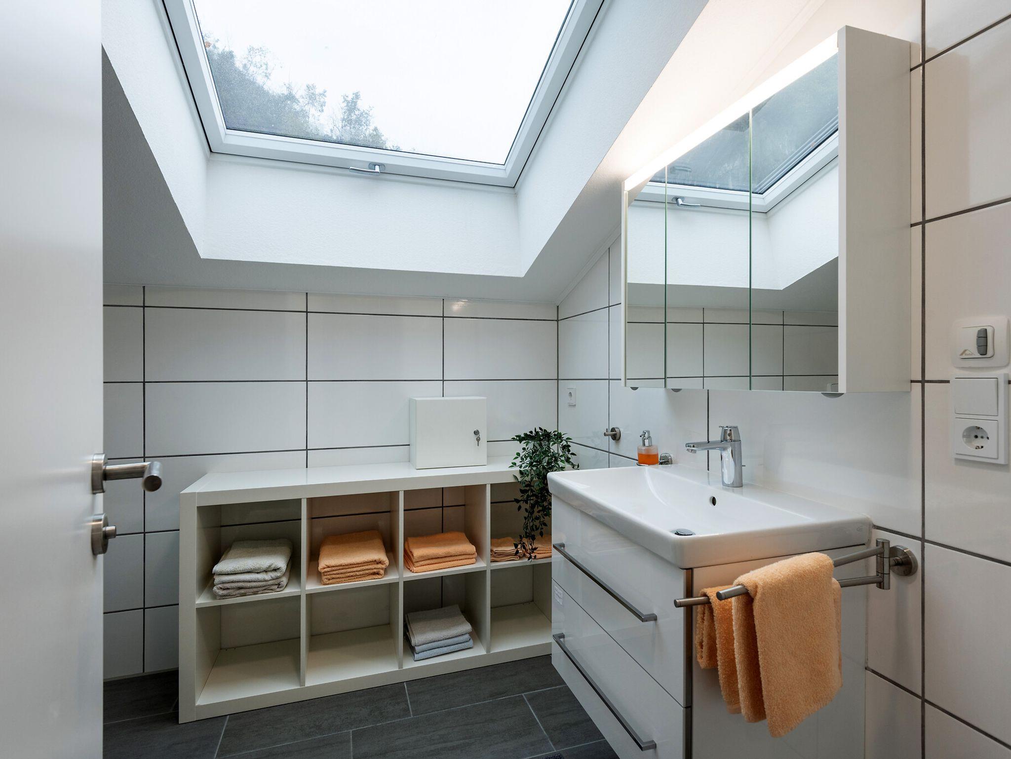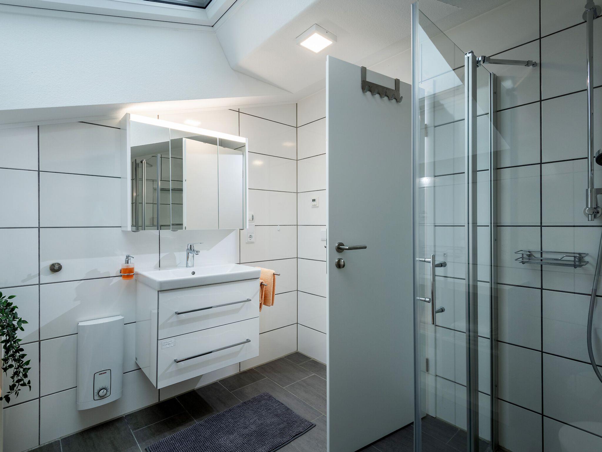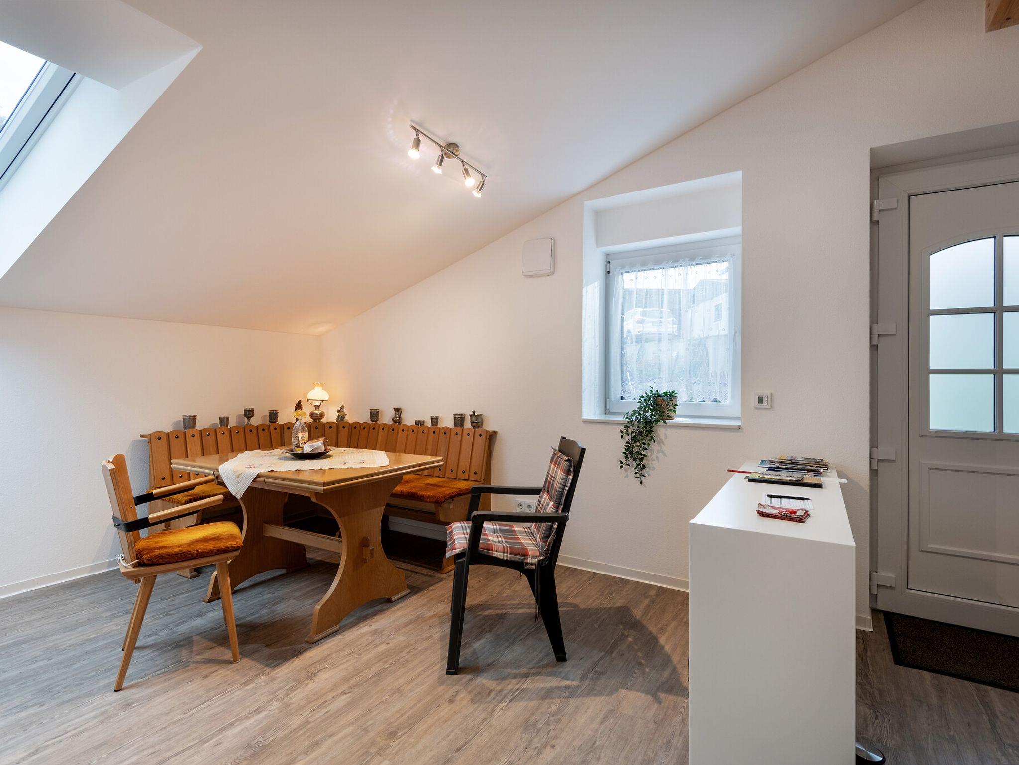 Geräumige Ferienwohnung mit einem Schlafzimmer (Doppelbett) und Schlafcoach (ca. 1,60 m breit) im Wohn-/Esszimmer, passend für bis zu 4 Erwachsenen. Eigener Parkplatz am Haus mit Treppenabgang zur Ferienwohnung im Dachgeschoss des Hauses. Ausstattungsjahr: 2025.