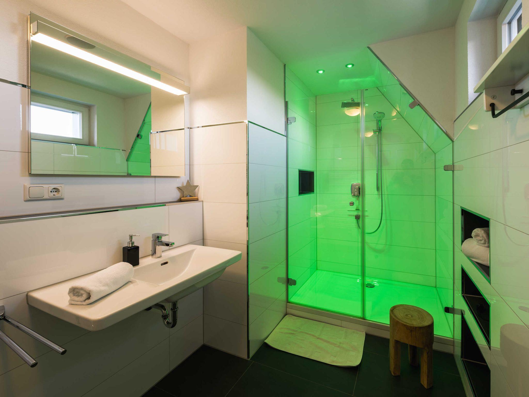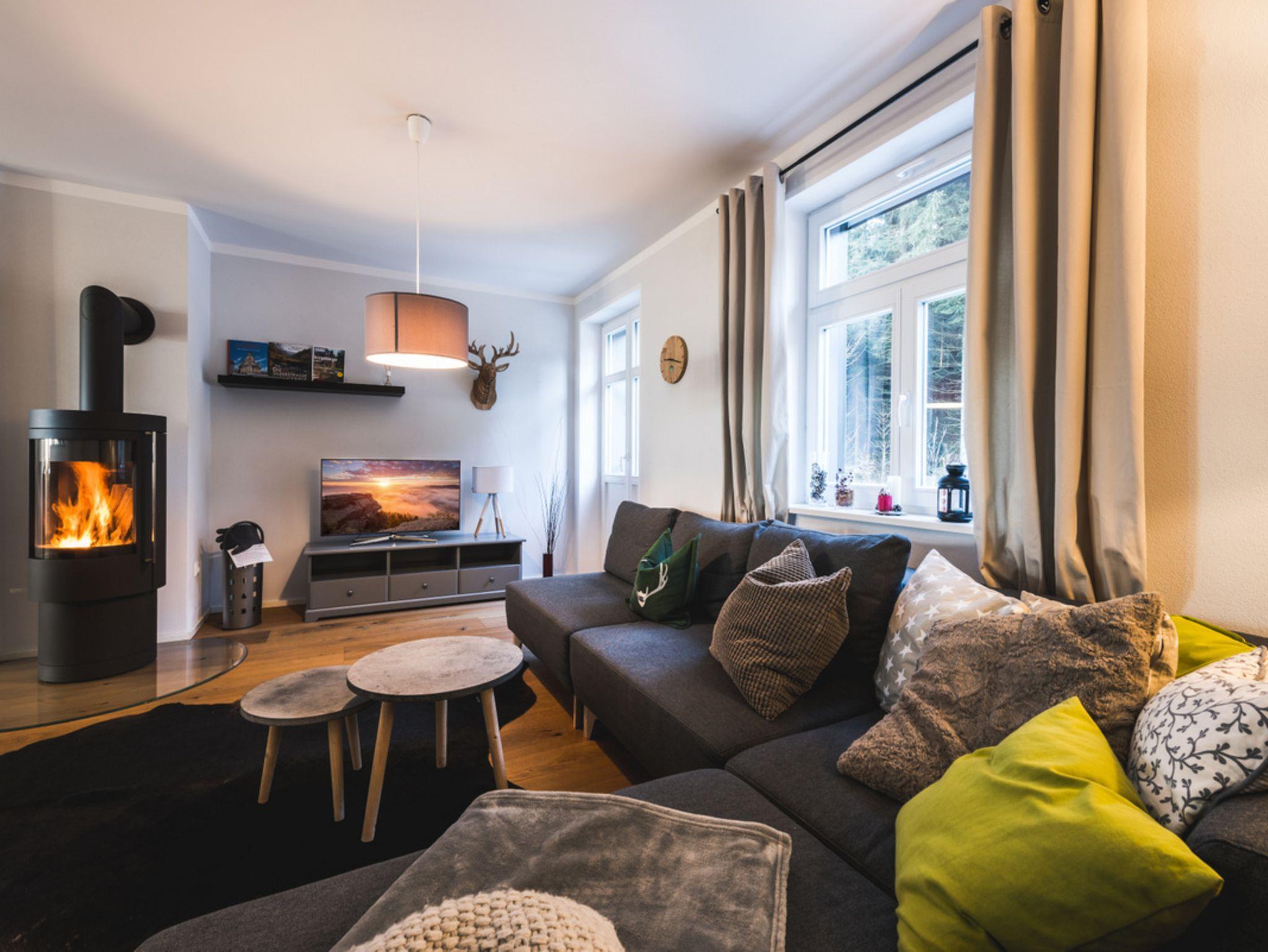 Dieses Ferienappartement ist purer Wohngenuss und bietet auf insgesamt 95 Quadratmetern viel Platz zum gemeinsamen Spielen mit den Kindern. Der gemütliche Wohnbereich mit Kamin grenzt an den großzügig und offen gestalteten, modernen Koch- und Essbereich. Von hier aus können Sie den Ausblick über das Erzgebirge Richtung Elbtal genießen und unter der großzügigen farblich beleuchteten Wellnessdusche alle Sorgen des Alltags vergessen. Die zwei getrennten Schlafzimmer mit Doppelbett sind Rückzugsort für jeden und laden zum Entspannen und Träumen ein.