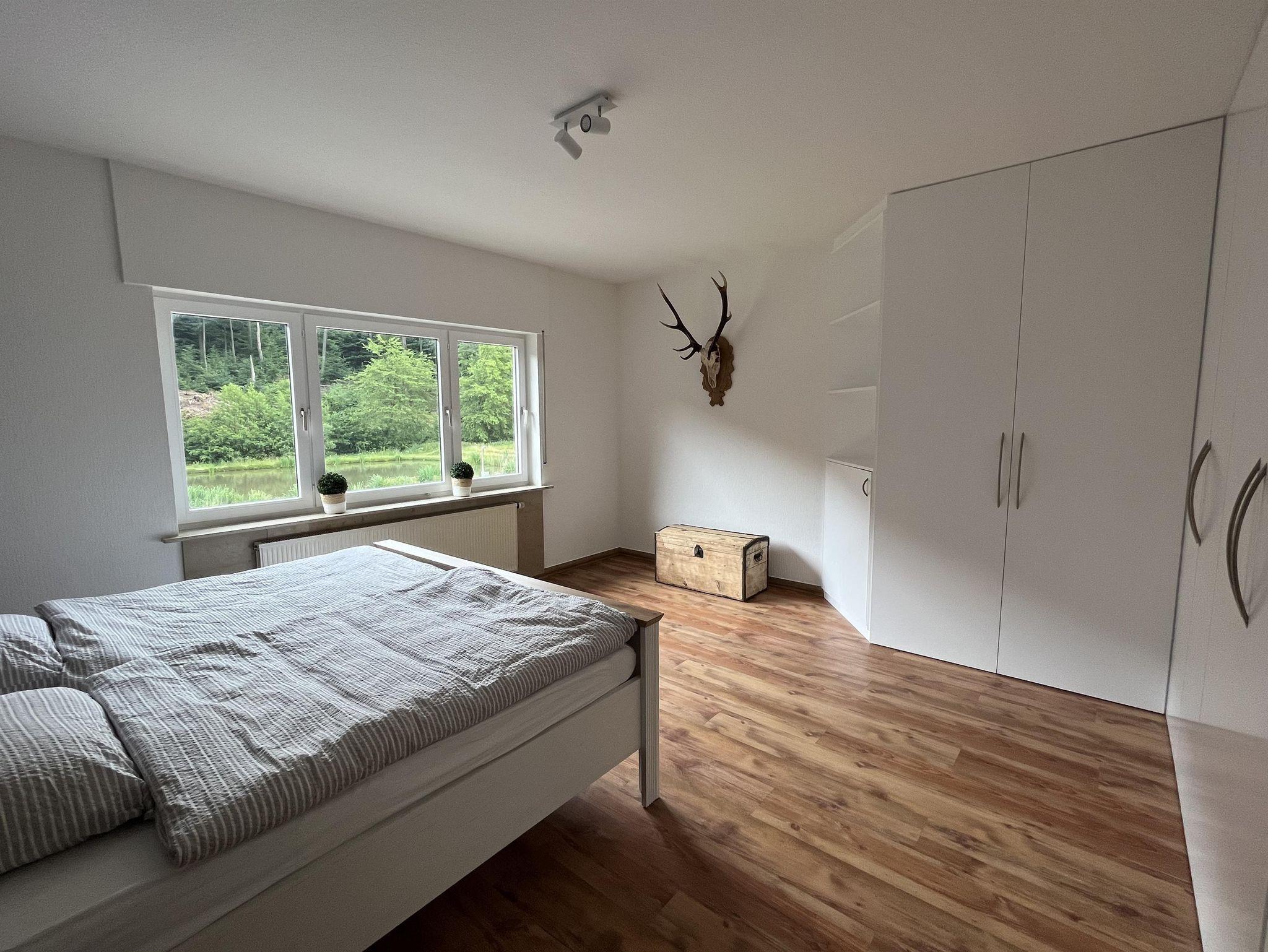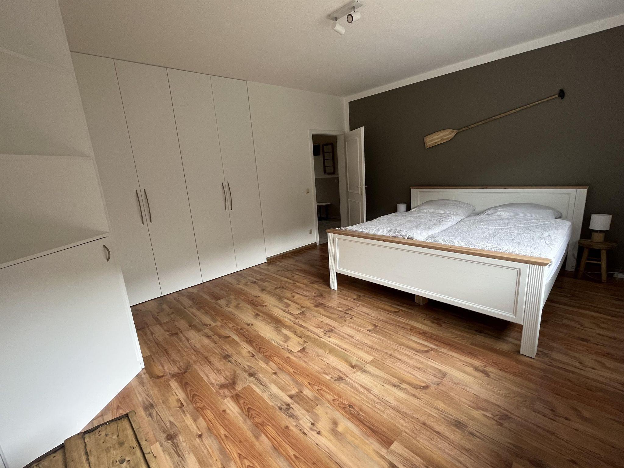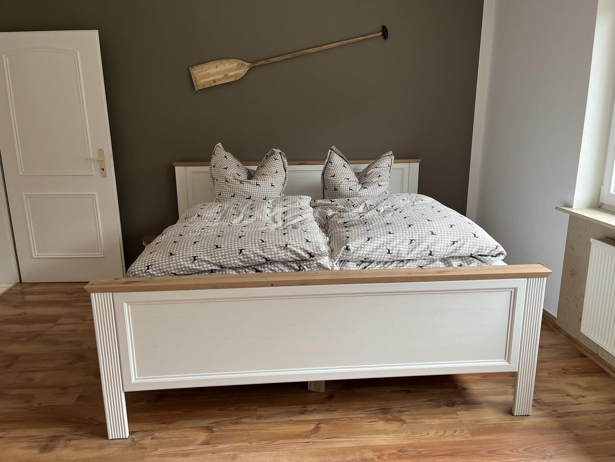 Schlafzimmer mit Doppelbett (2 Matratzen, Liegefläche 180x200 cm), auf Wunsch kann ein Kinderbett gestellt werden, großer Einbaukleiderschrank.