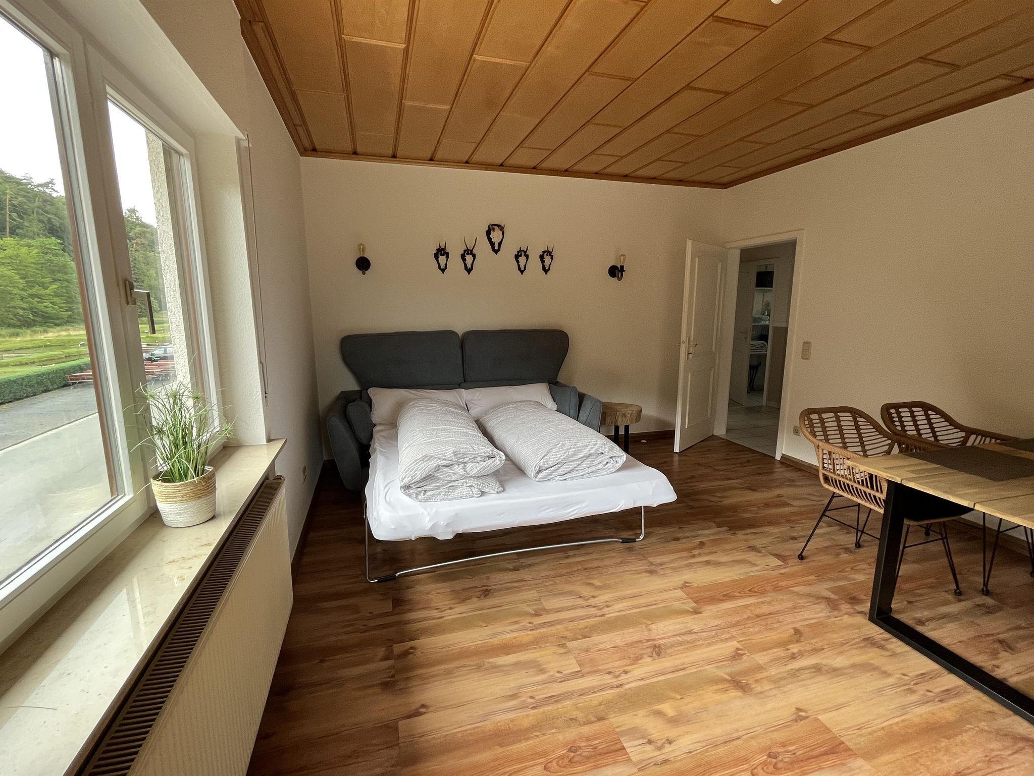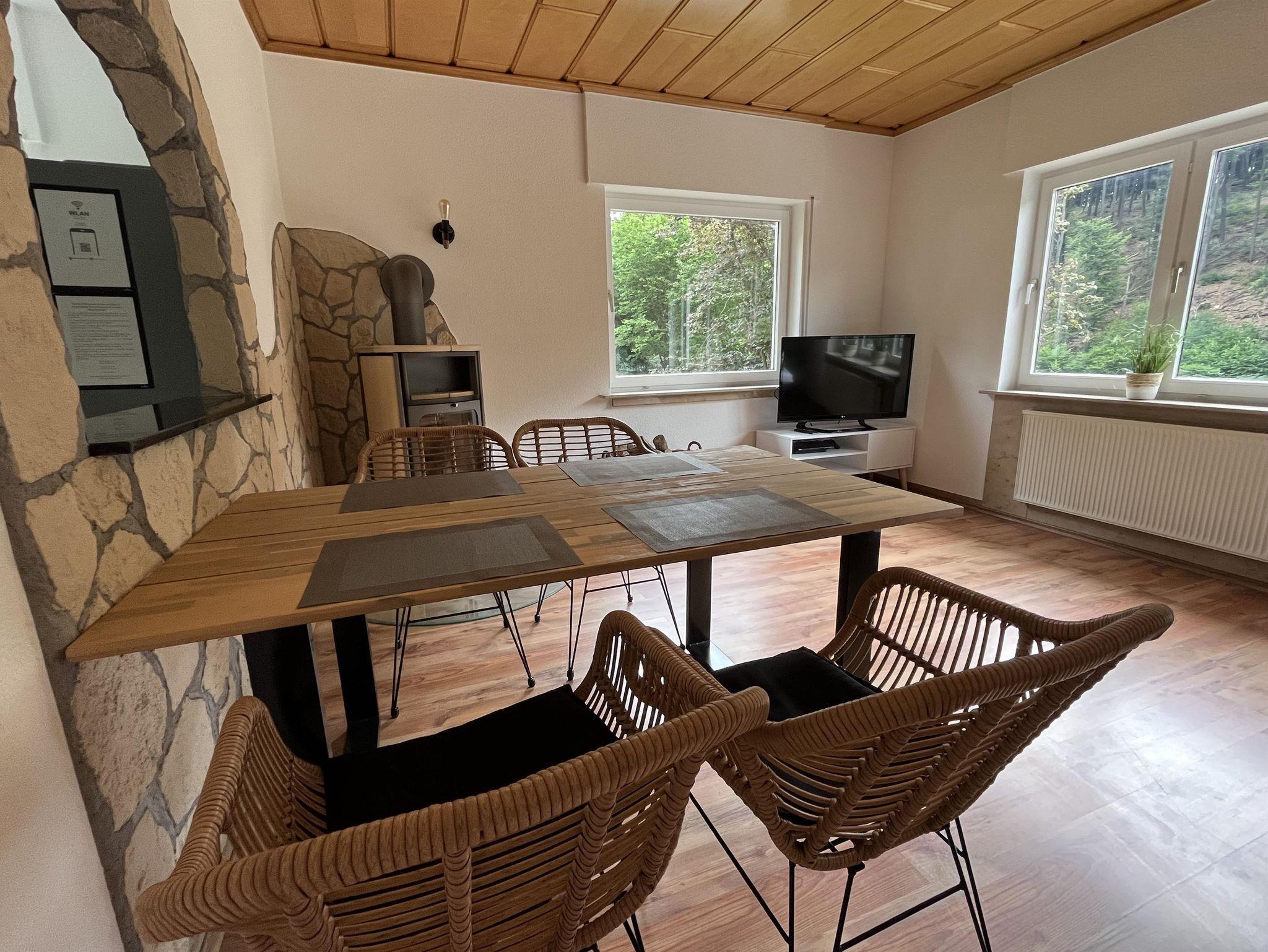 Wohnzimmer mit Esstisch für 4 Personen, Schlafsofa (1 Matratze, Liegefläche 140x200 cm), Flachbild-TV mit Satellitenempfang und DVD-Player, Holzofen, Gesellschaftsspiele.