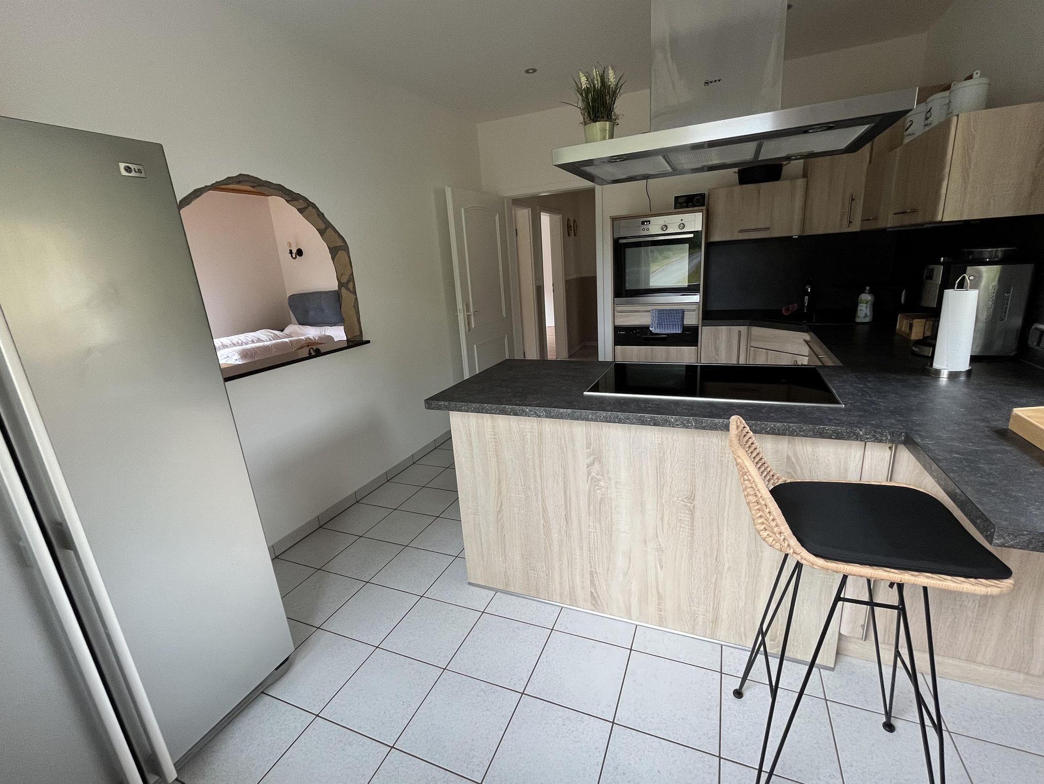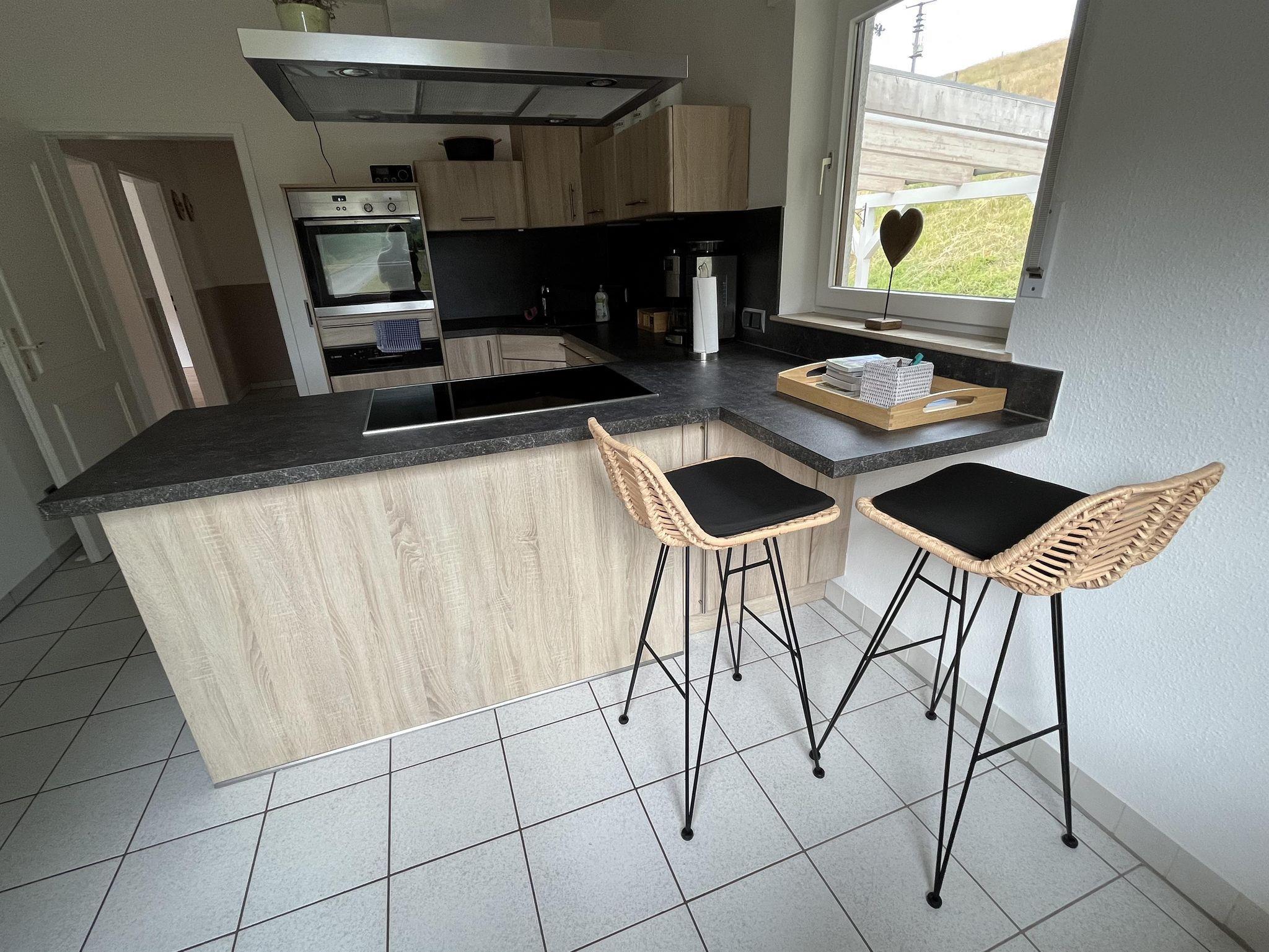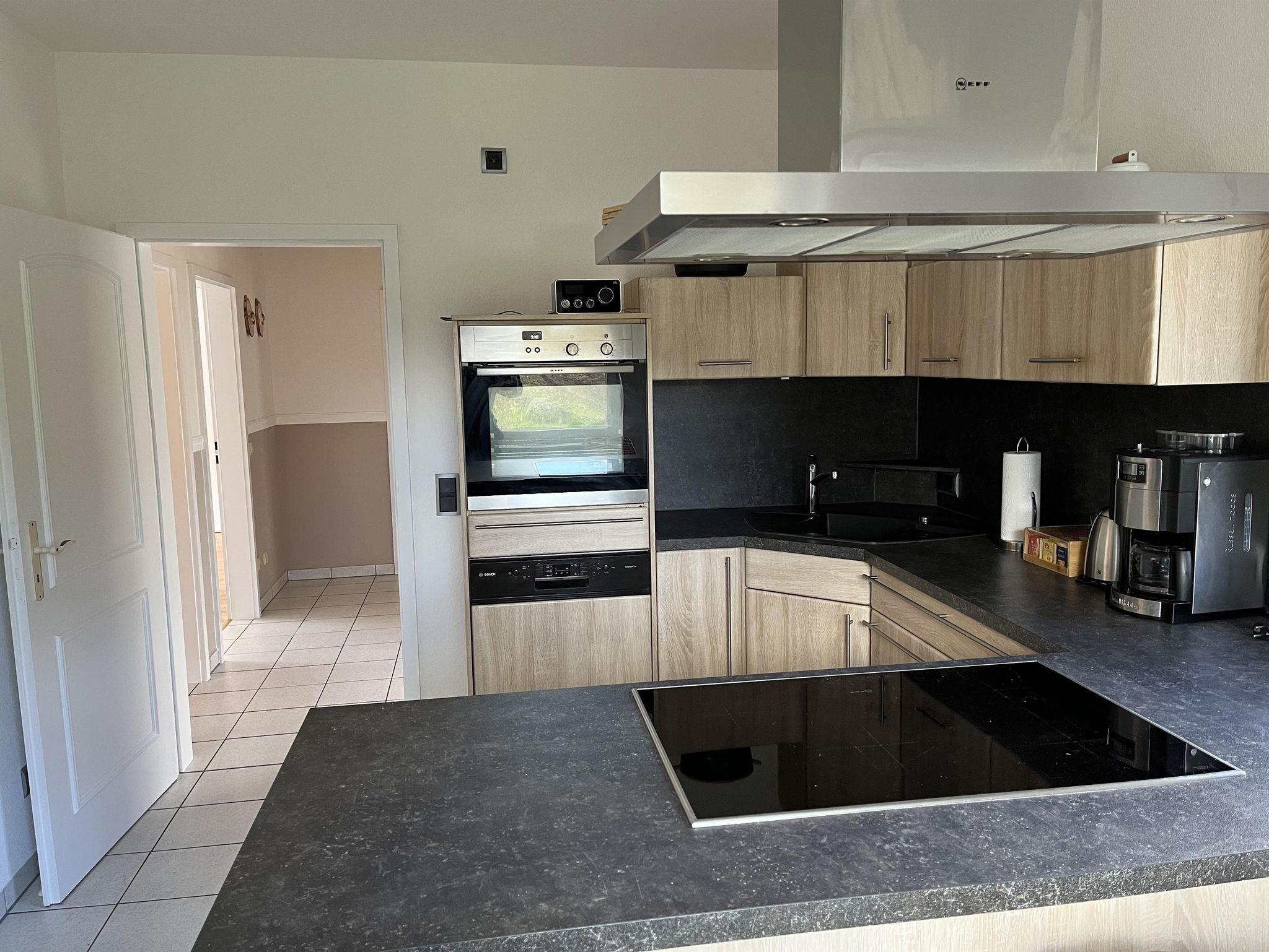 Voll ausgestattete Küche mit hochwertigen Elektrogeräten, Spülmaschine, Cerankochfeld, erhöhter Backofen, Side-by-side-Kühlschrank mit Gefriermöglichkeit, Kaffeemaschine, Wasserkocher, Toaster, Mixer, Radio.