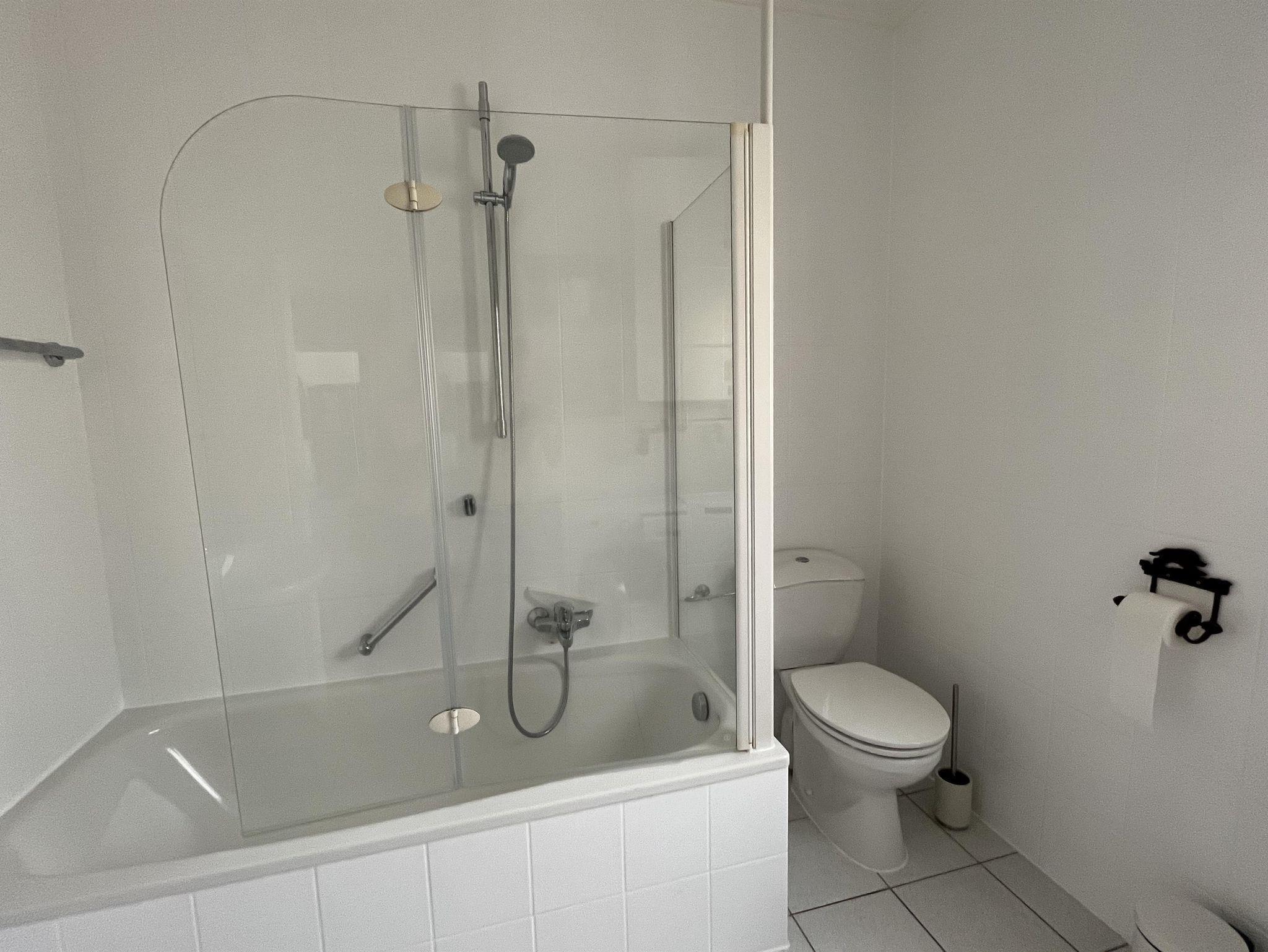 Badezimmer mit Badewanne mit Wannendusche, WC, Waschmaschine, Trockner, Haarföhn.