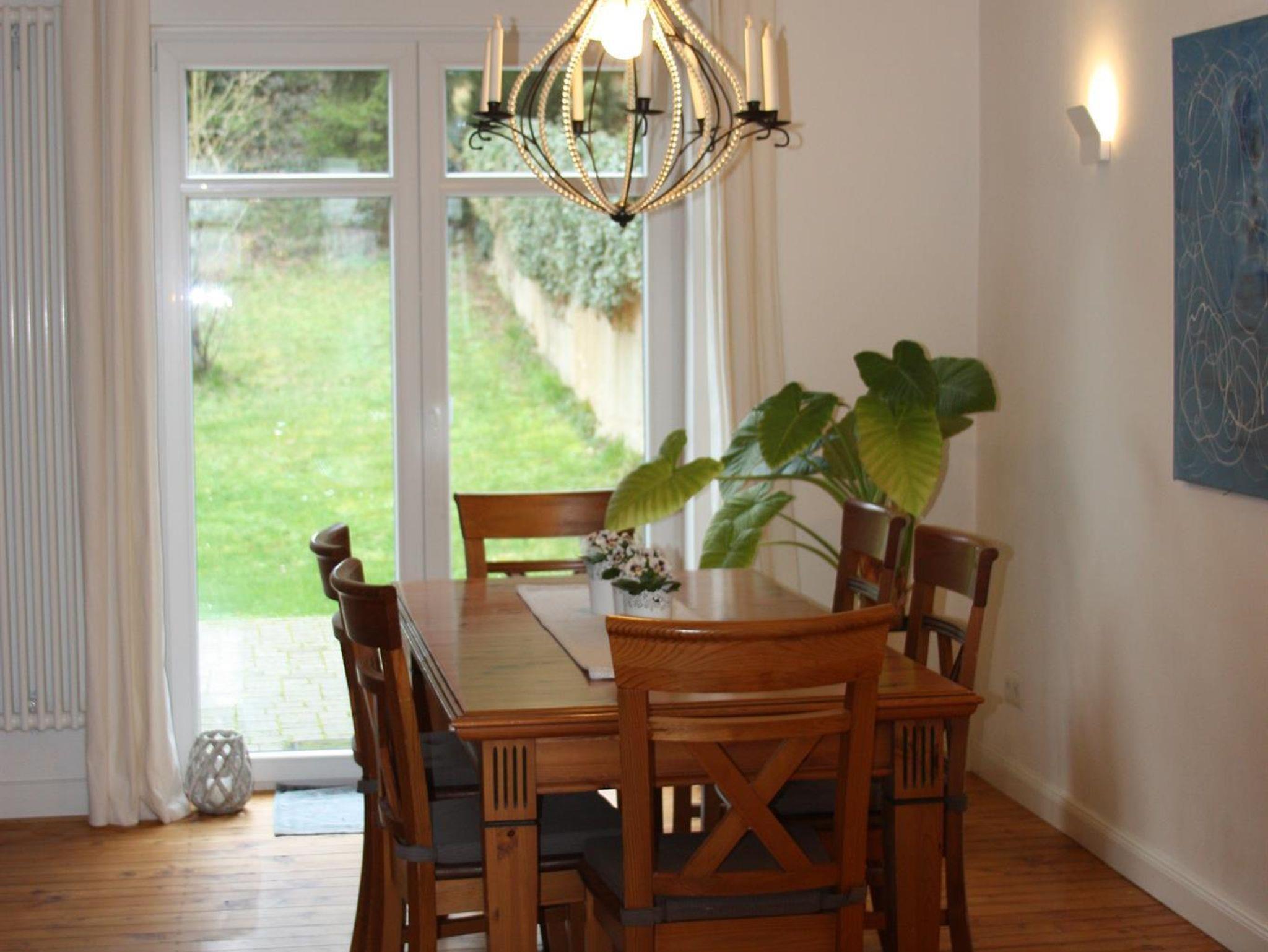 Im Erdgeschoss befindet sich die große gut ausgestattete Küche mit Kaffeevollautomat, Geschirrspüler, Induktionsherd, Mikrowelle, Kühl-/Gefrierkombination und Backofen. Der Wohn-/Essbereich mit Kaminofen bietet durch eine Flügeltür den Zugang zur Terrasse. Die große möblierte Terrasse mit angrenzender Liegewiese und schatten spendende Bäumen lädt zum Entspannen ein.