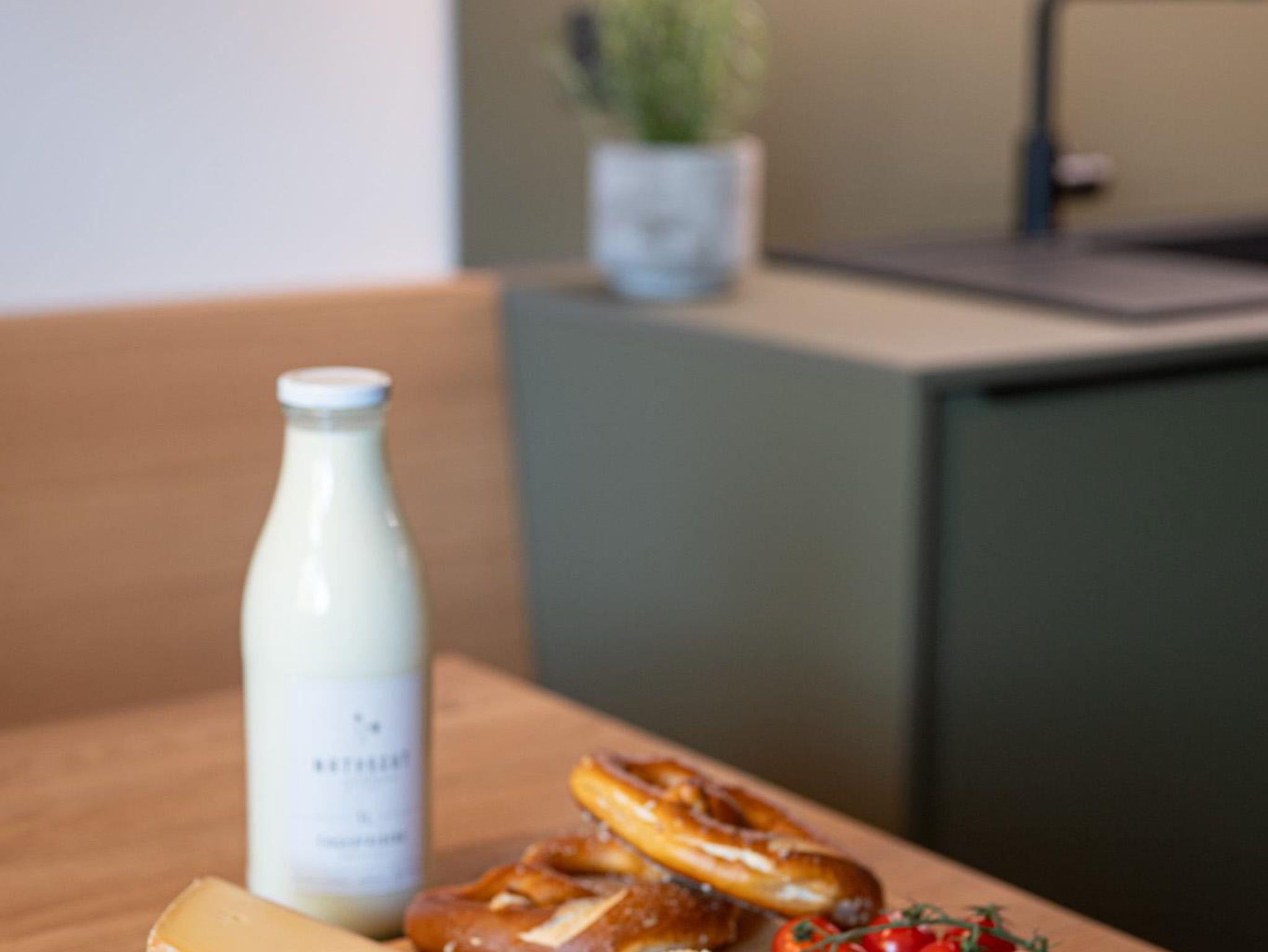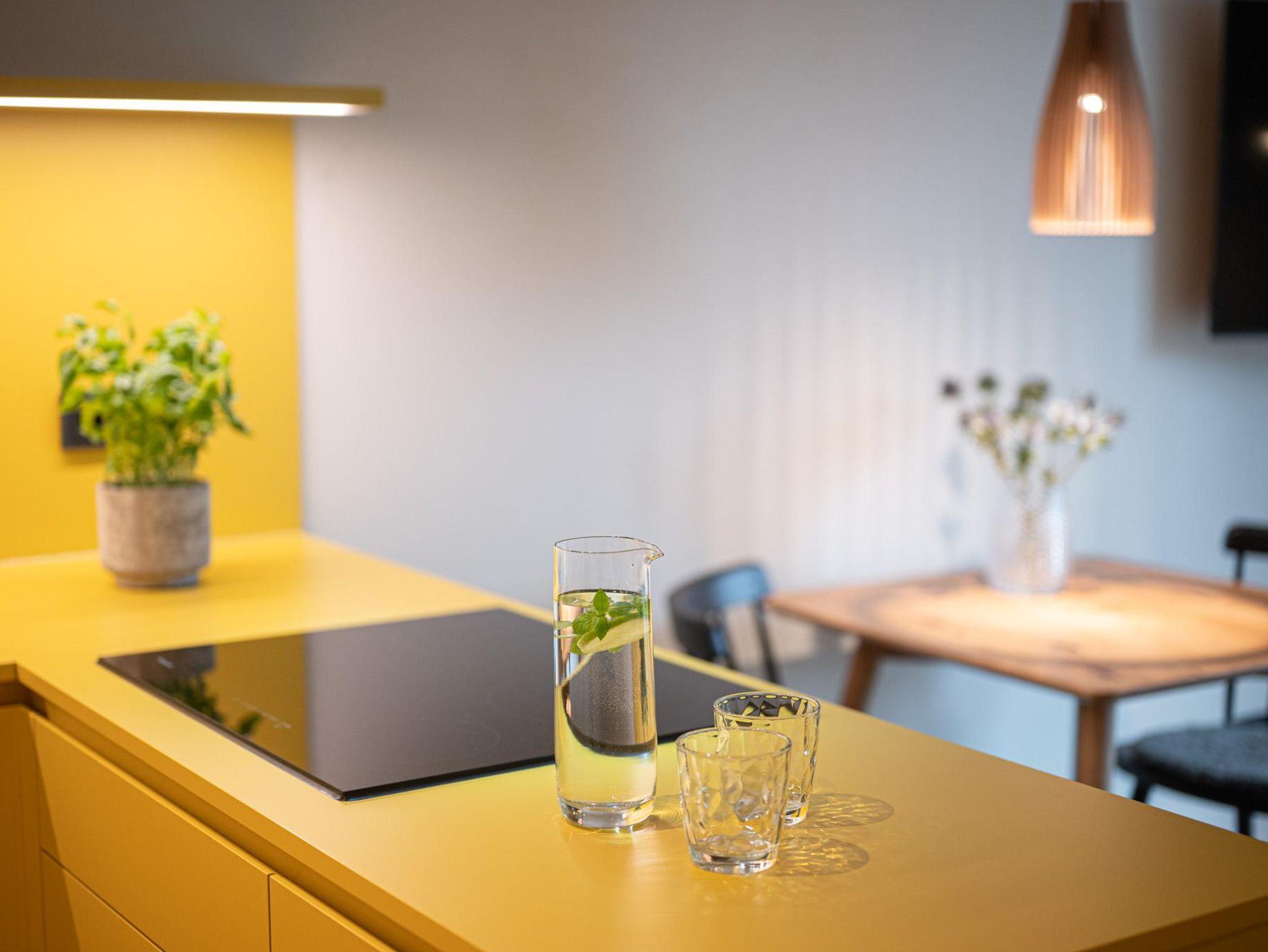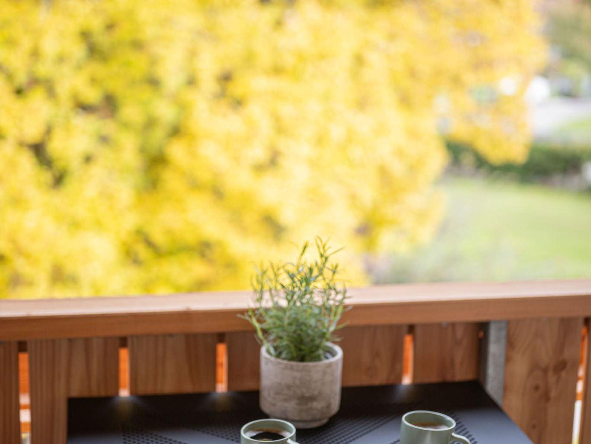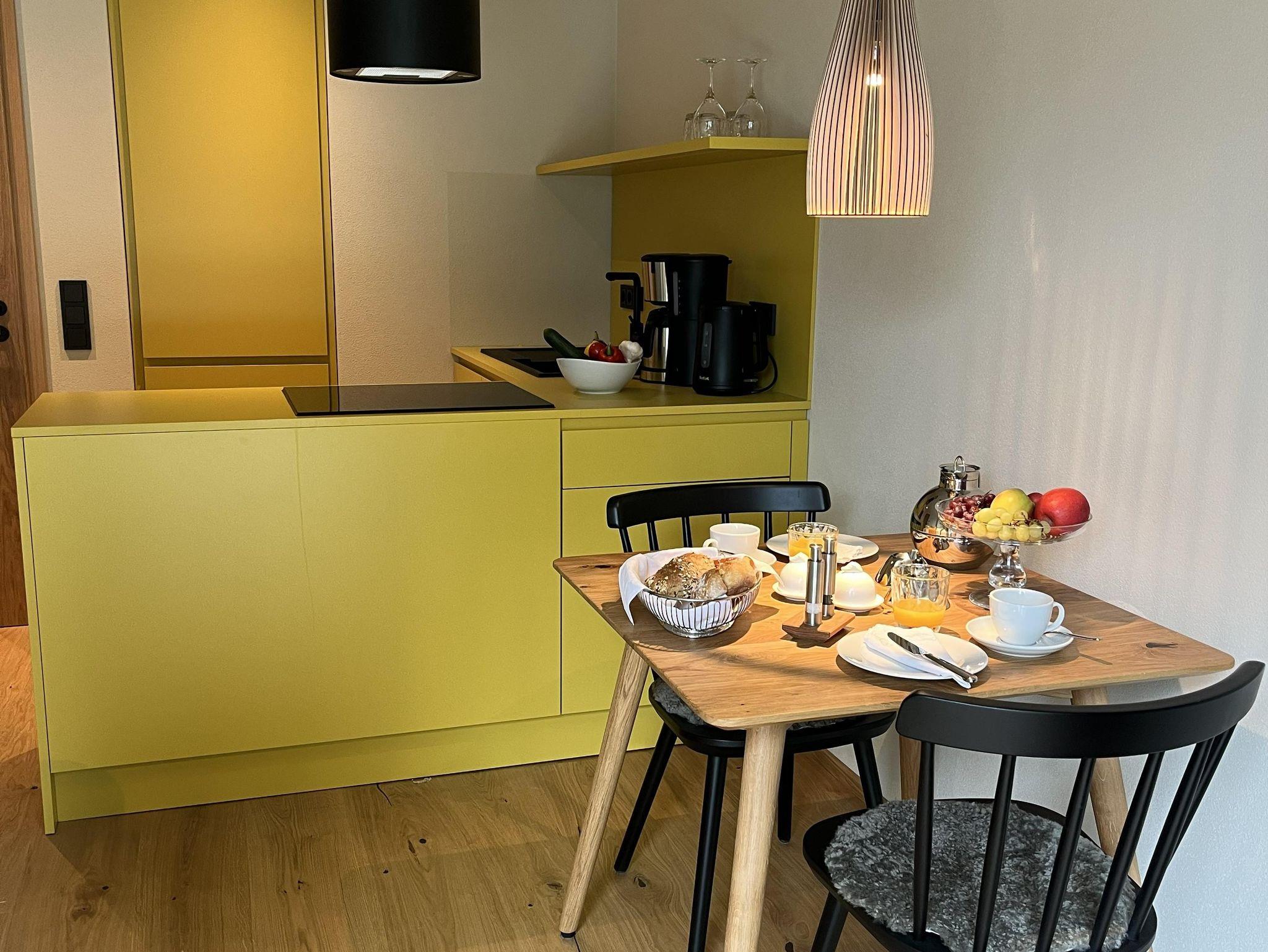 Hier lässt es sich gut sein. Die großzügige Terrasse mit Panoramablick lädt zum Durchatmen ein, während die offene Wohnküche mit Spülmaschine, Kühlschrank, Herd und Backofen bestens ausgestattet ist. Am Esstisch für zwei lässt sich der Tag entspannt starten – ob mit Kaffee in der Morgensonne oder einem gemütlichen Abendessen.