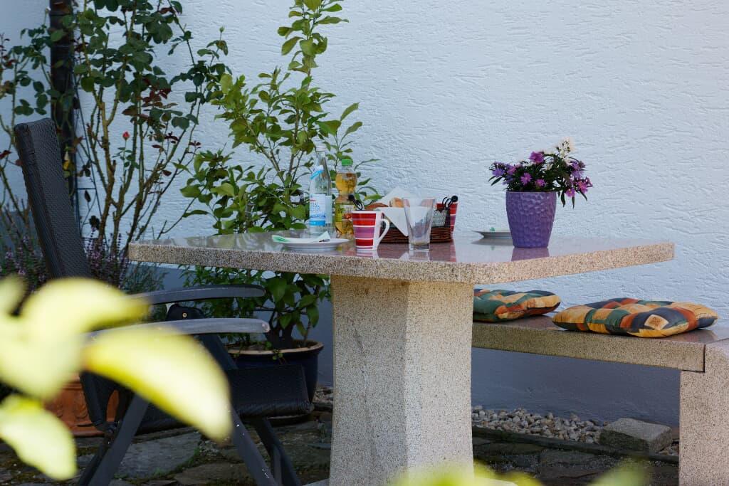 Eine Gartenterrasse (Süd-West Lage) mit Sitzgelegenheit lädt zur alleinigen Nutzung zum Verweilen ein.