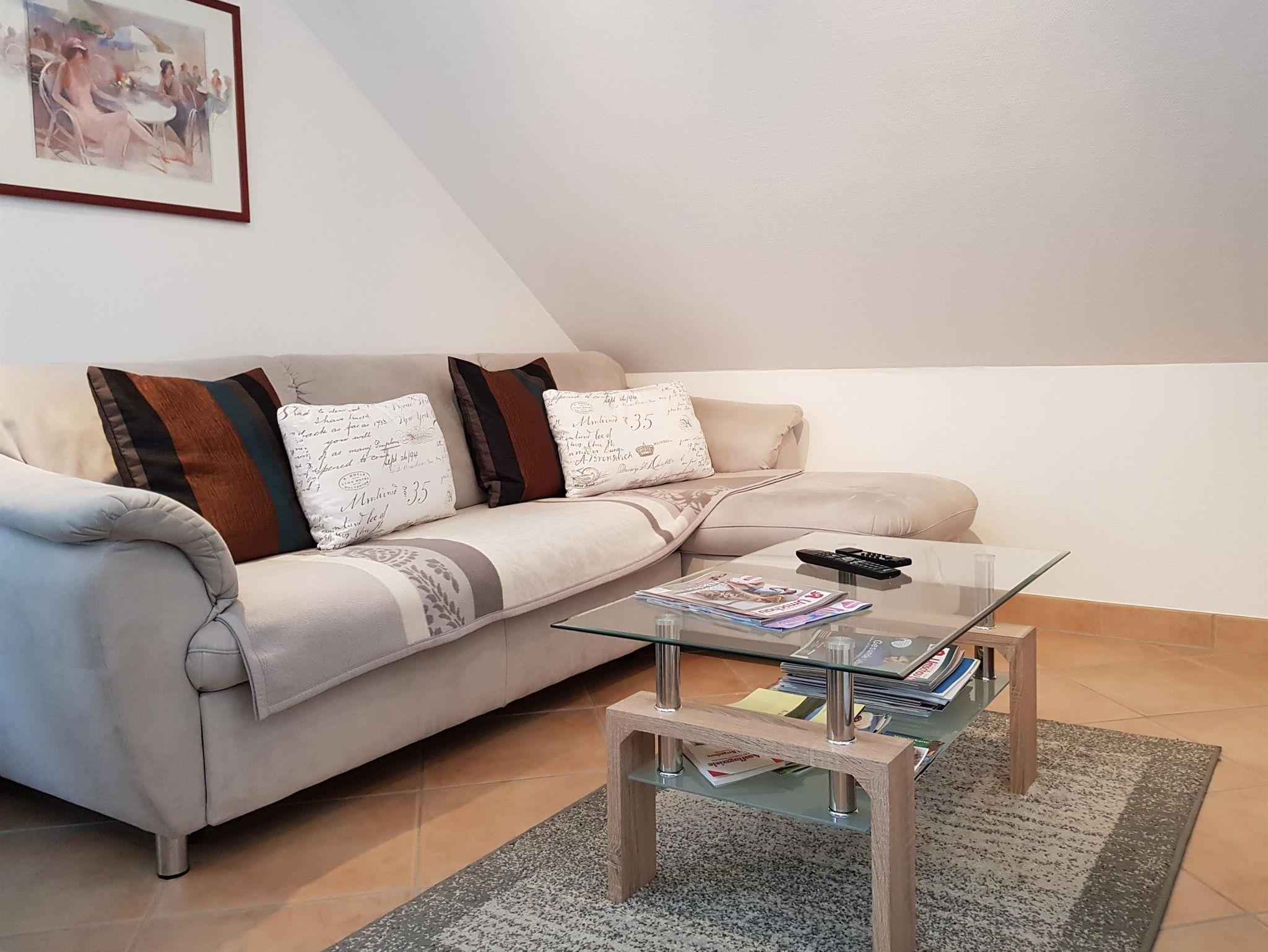 Unsere Ferienwohnung, im Dachgeschoß gelegen, ist eine großzügige, lichtdurchflutete 2-Zimmer Wohnung mit 54 qm Wohnfläche sowie einer 12 qm großen überdachten Loggia und besteht aus: