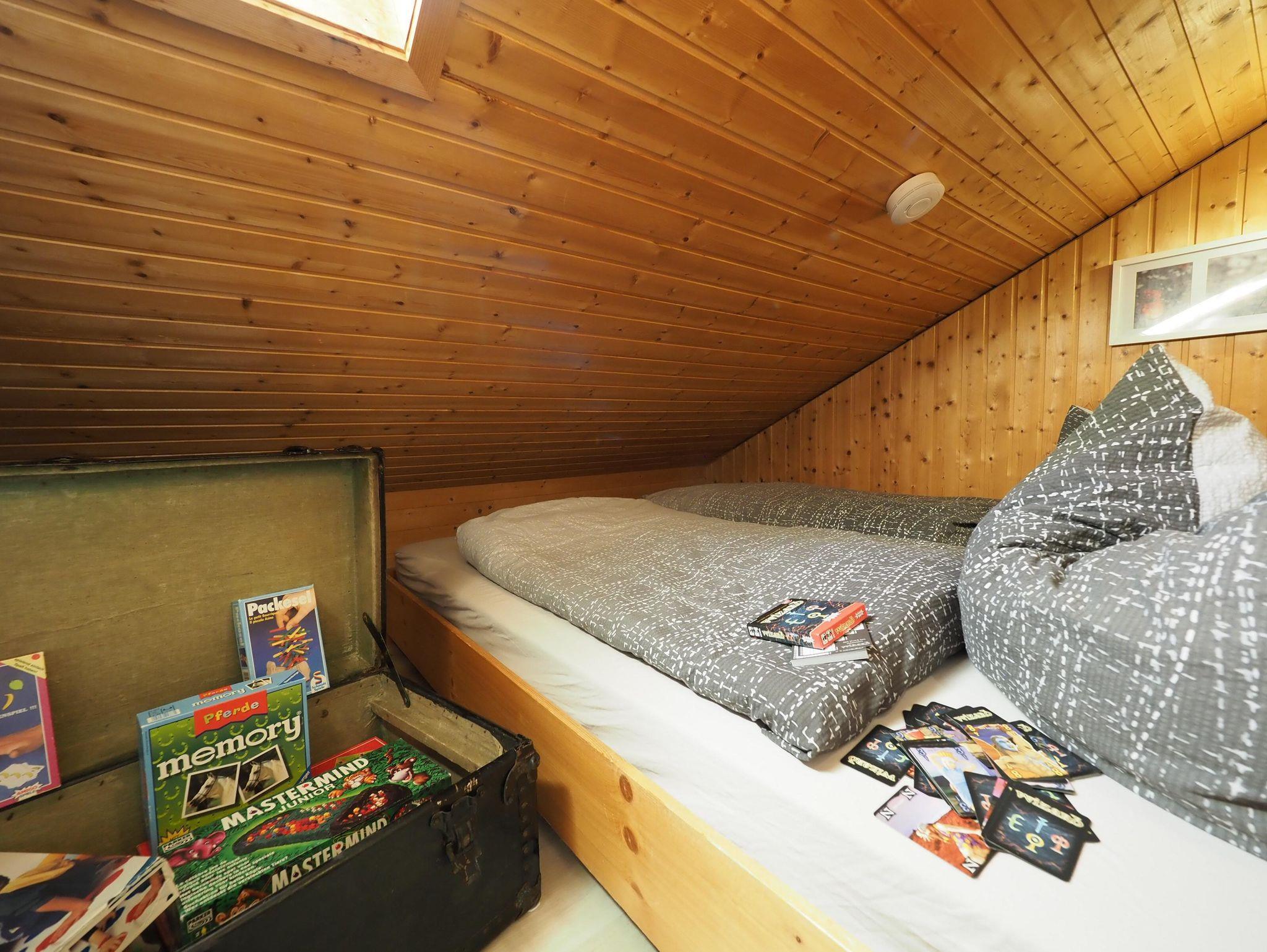 Direkt im Anschluss an das Schlafzimmer: Das Reich der Kleinen. In unserer Dachkammer können die Kinder in aller Ruhe unsere Spielekiste erforschen.