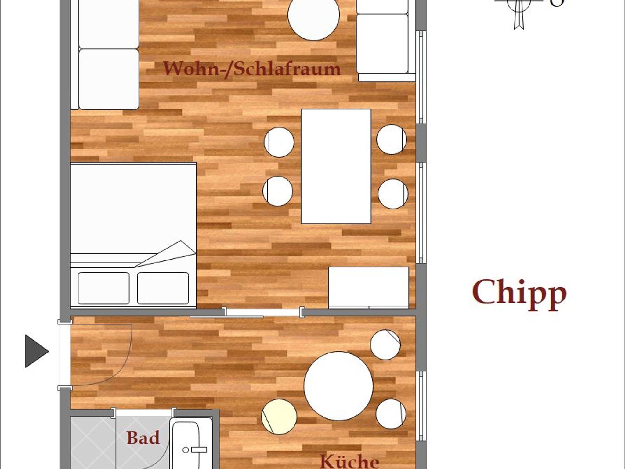 In unserem freundlich-hellen Appartement Chipp (34 m2) werden Sie von der Morgensonne geweckt. Und wir wünschen uns gerne recht häufig fröhliches Kinderlachen dazu.