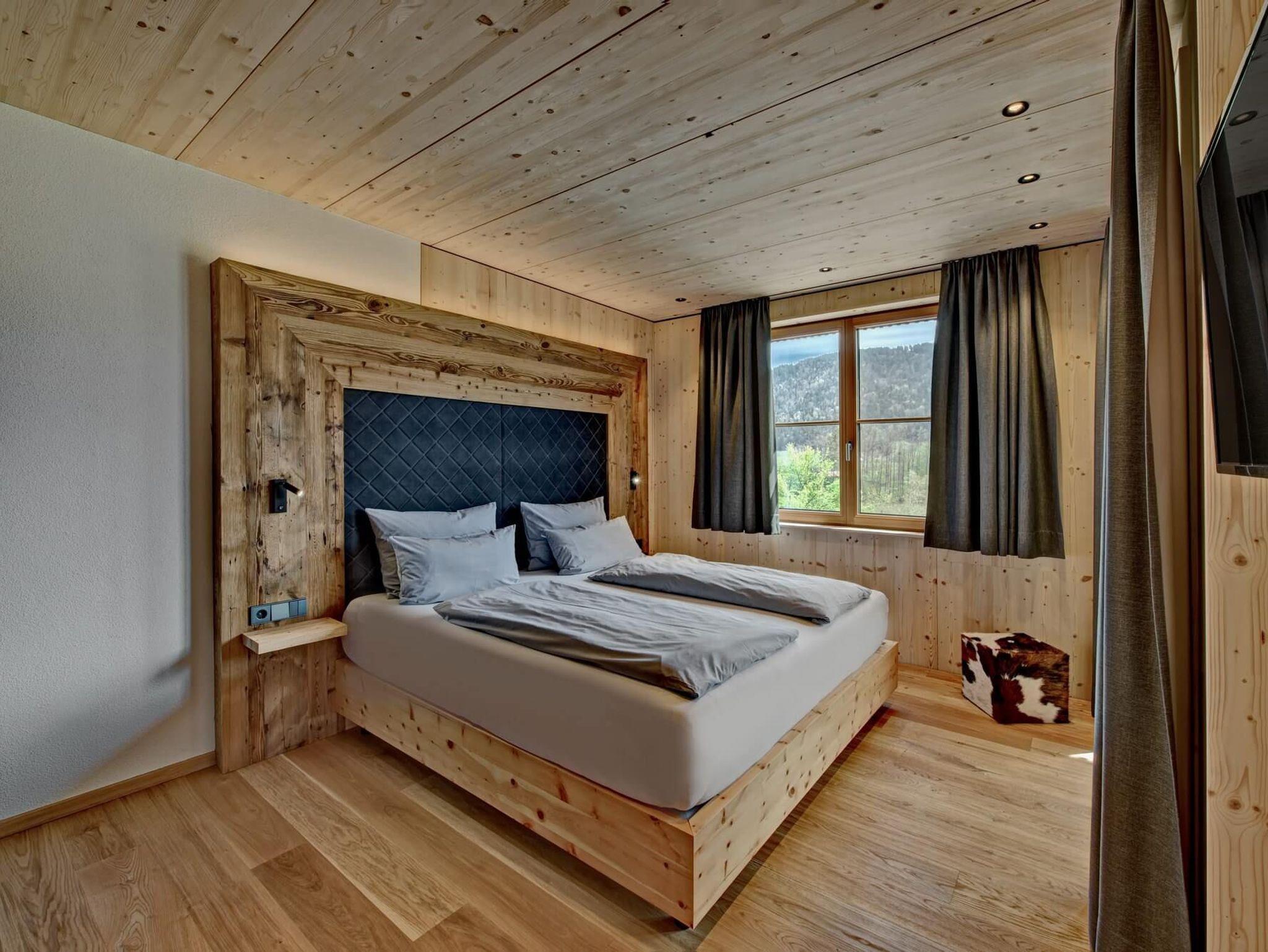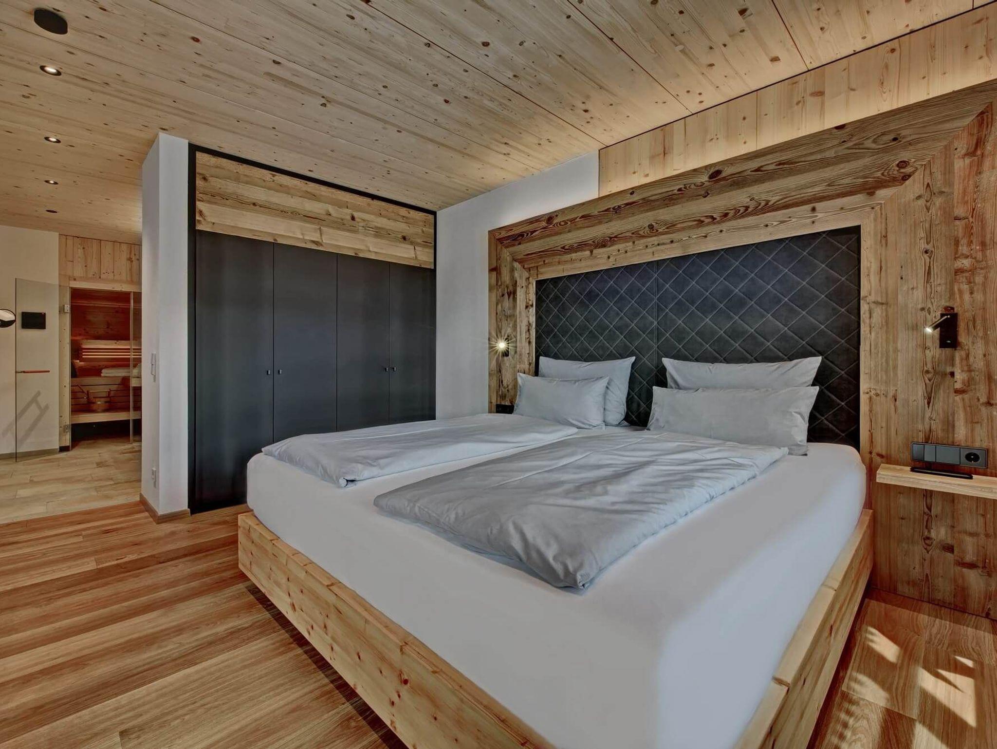 Im Schlafzimmer im Anschluss an ein offen und luxuriös ausgestattetes Bad erwartet Sie 1 King-Size Doppelbett (200x200) mit wohlig weichem und bequemen Zirbelholz-Boxspringbetten. Zwei weitere Personen finden Platz auf der ausziehbaren und hochwertigen Echtleder-Schlafcouch im Wohnbereich.