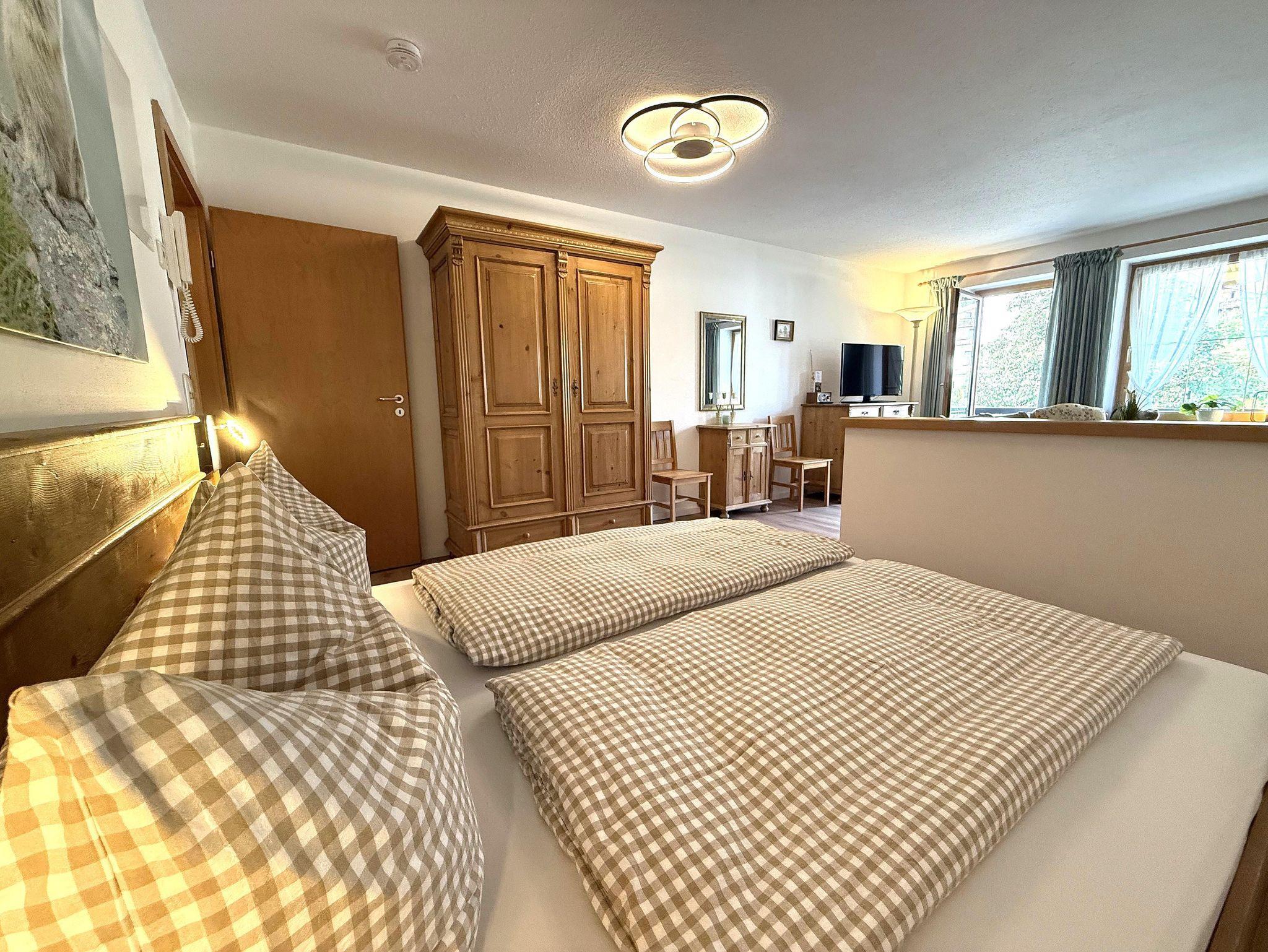 Mit Allgäuer Charme - in dem gemütlichen, großen Doppelbett bekommt man den erholsamen Schlaf, die Couch mit Schlaffunktion, der Essbereich und der überdachte möblierte Balkon laden zum Verweilen ein. WLAN, ein großer TV und ein modernes All-in-One Radio sorgen dabei für beste Unterhaltung.