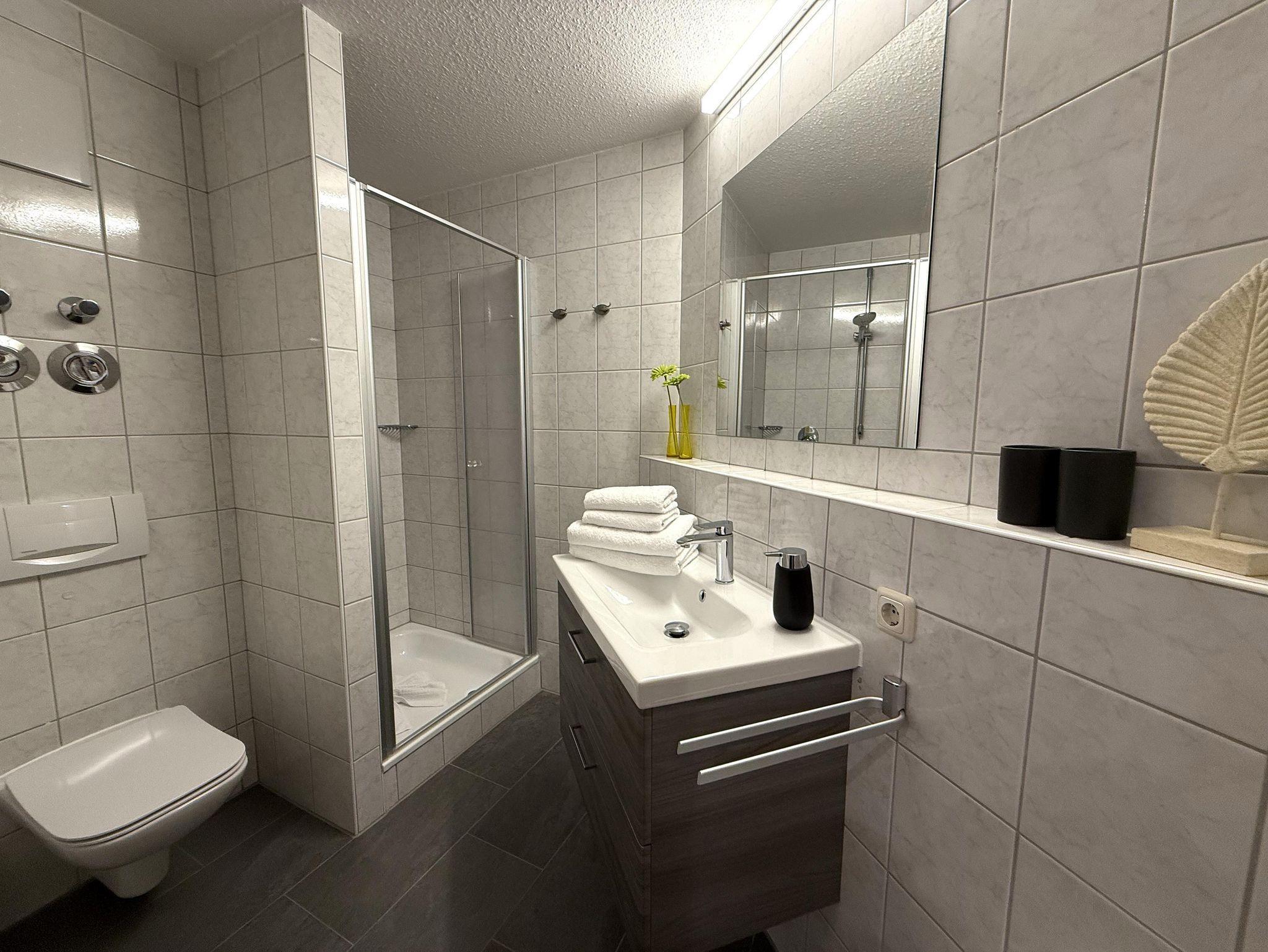 Das moderne Badezimmer punktet mit Waschtisch/Unterschrank, geräumiger Dusche, Hocker, Fön und WC.
