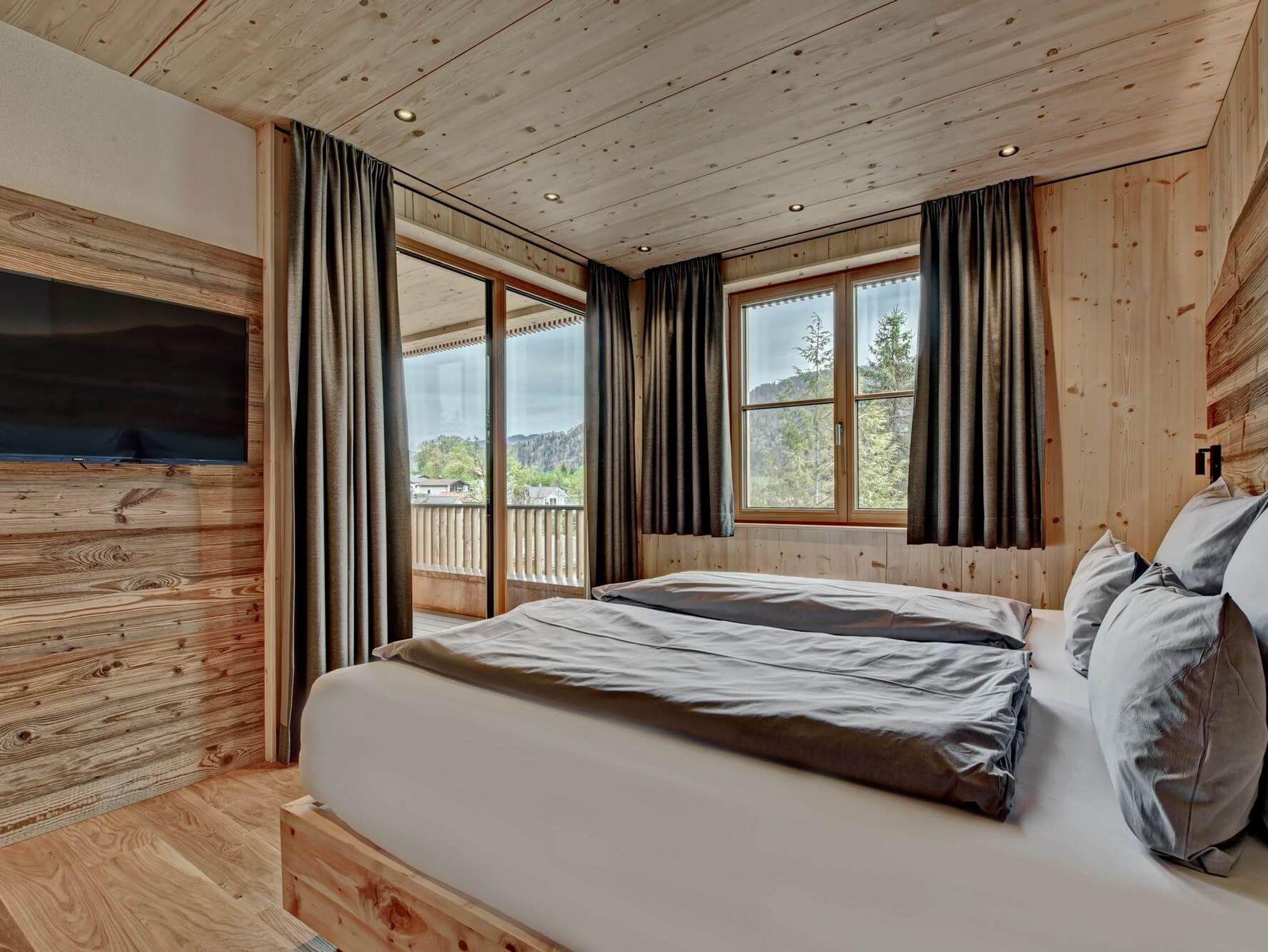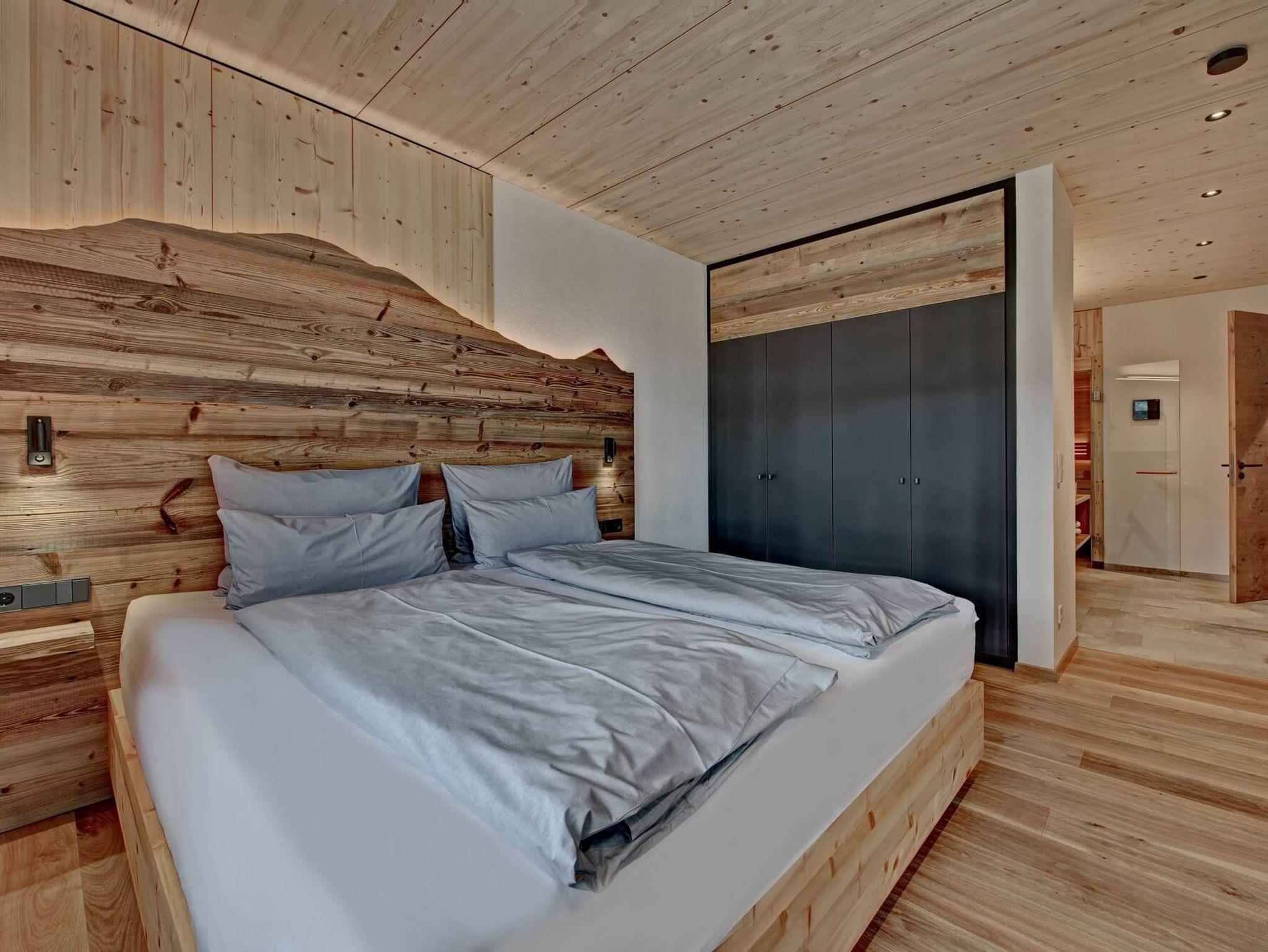 Im Schlafzimmer im Anschluss an das luxuriös ausgestattete Bad erwartet Sie ein King-Size Doppelbett (200x200) mit wohlig weichem und bequemen Zirbelholz-Boxspringbetten. Zusätzlich finden zwei weitere Personen auf der ausziehbaren Echtleder-Schlafcouch Platz.