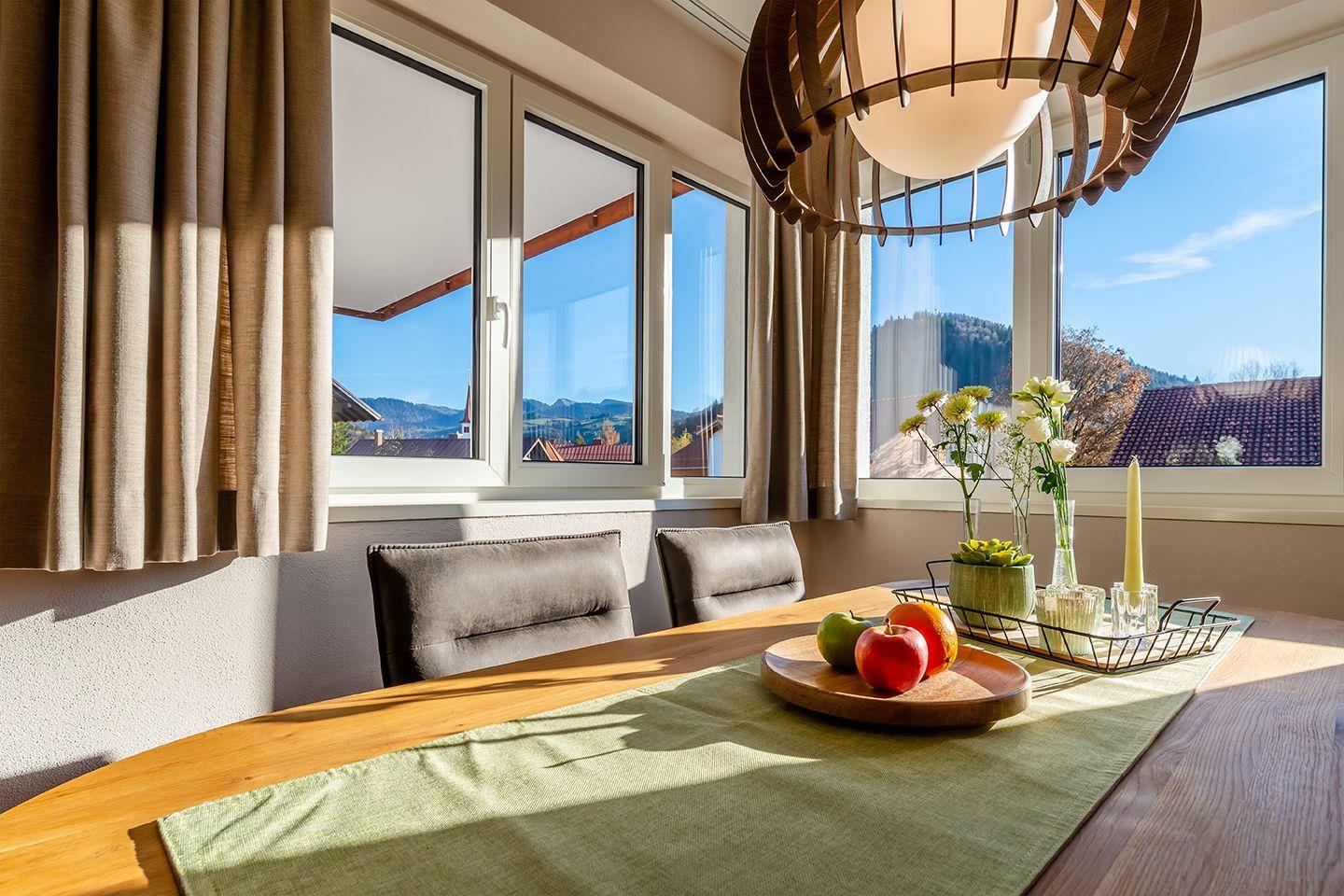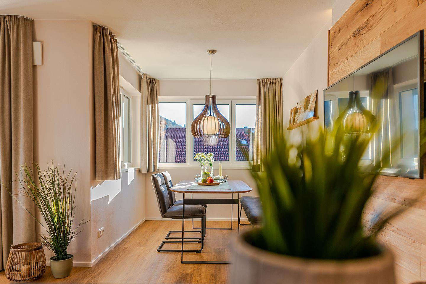 Unsere Ferienwohnung ist hell, freundlich und modern eingerichtet. Mit viel Holz, viel Wärme und Liebe zum Detail. So lässt sich unsere Ferienwohnung „Berggold“ im 1. Obergeschoss am einfachsten beschreiben. Sie verfügt über einen großen Wohn- und Essbereich, Balkon, Bad mit Dusche & WC und zwei Schlafzimmer für bis zu 4 Personen.