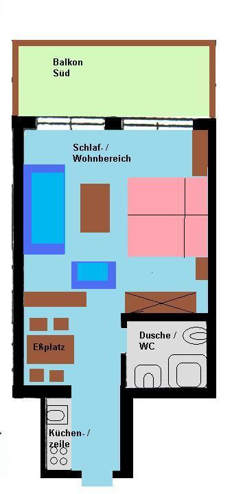 1 - Raum Appartement, 35 m², 1. Obergeschoss, Südseite, Südbalkon, Doppelbett, TV, Küchenzeile, Mikrowelle, Dusche/WC