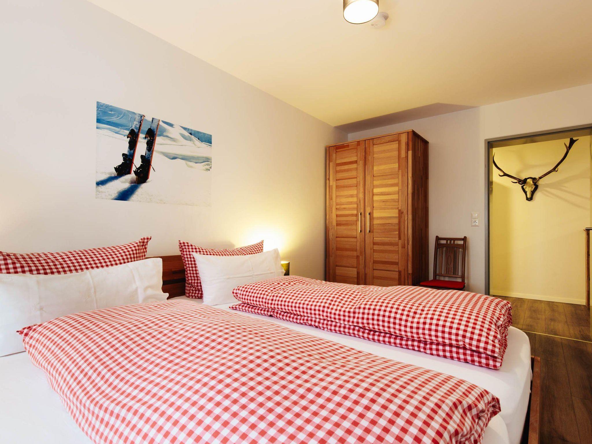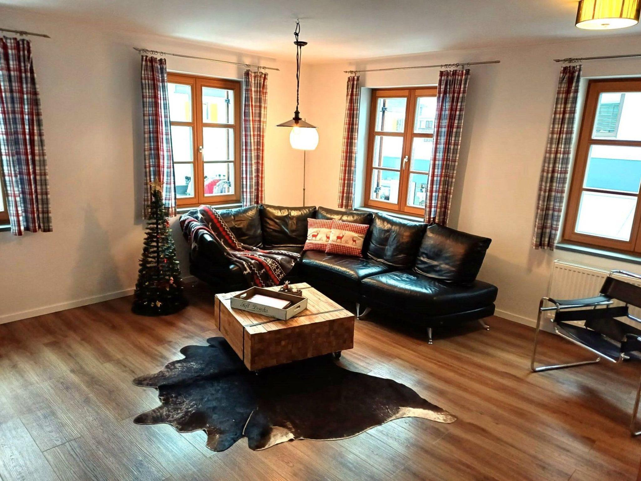 3 Zimmer, Küche, Bad Ferienwohnung mit 82 m² für 1 bis 4 Personen, 2 Schlafzimmern, Wohnzimmer, separate Küche mit Eckbank, 1. Obergeschoß, Südbalkon, Bergblick, Kinderzustellbett/-hochstuhl auf Anfrage möglich