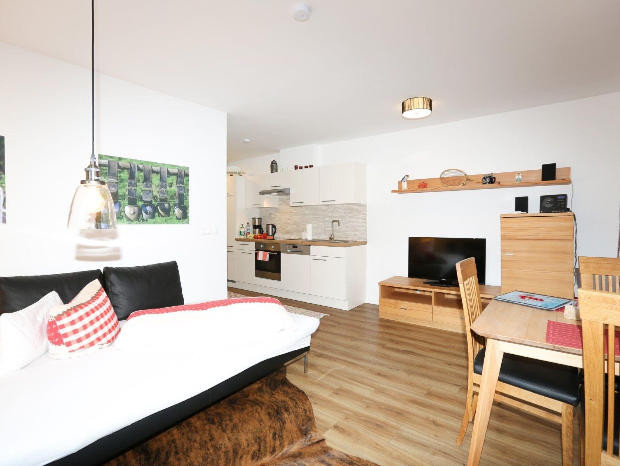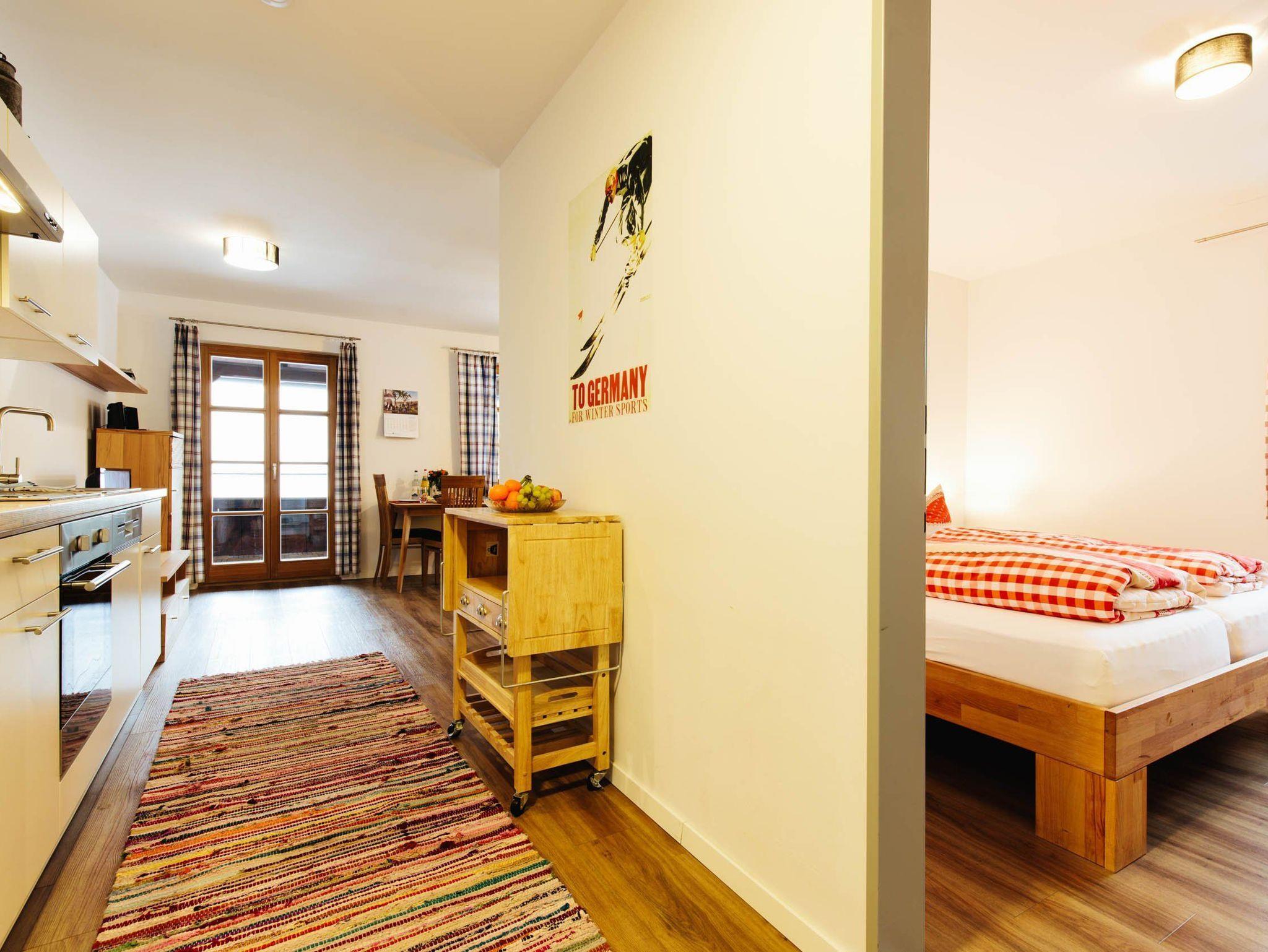 2 Zimmer Ferienwohnung mit 49 m² für 1 bis 2 Personen, 2 Räume mit 1 Schlafzimmern, 1. Obergeschoß, Balkon, Bergsicht, Kinderzustellbett/-hochstuhl auf Anfrage möglich