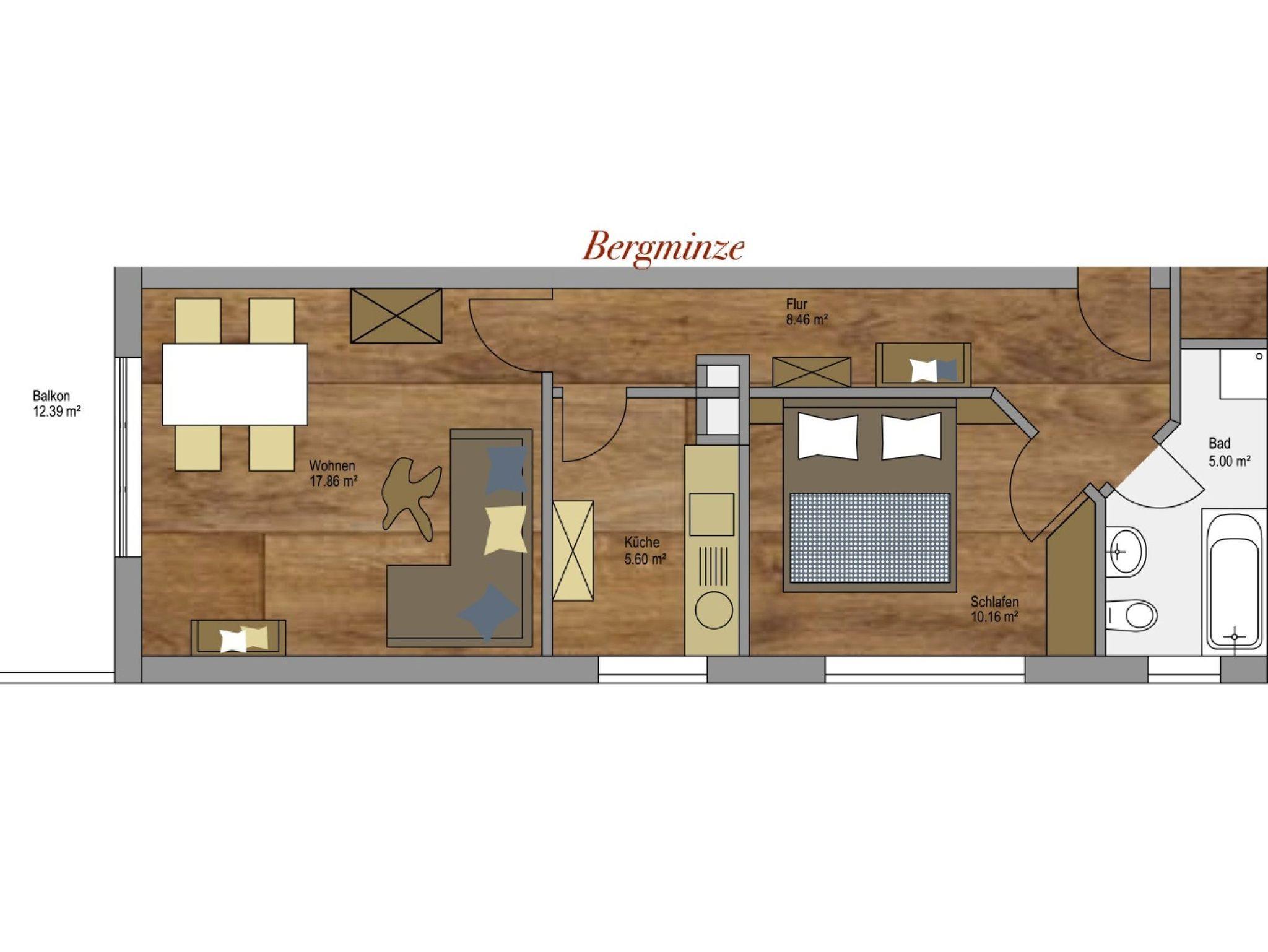 Die 60 m² große Ferienwohnung Bergminze befindet sich im ersten Obergeschoss des Landhauses und verfügt ebenfalls über einen sonnigen Südbalkon mit traumhafter Aussicht. Wohn- und Schlafbereich sowie Küche sind jeweils separate Räume.