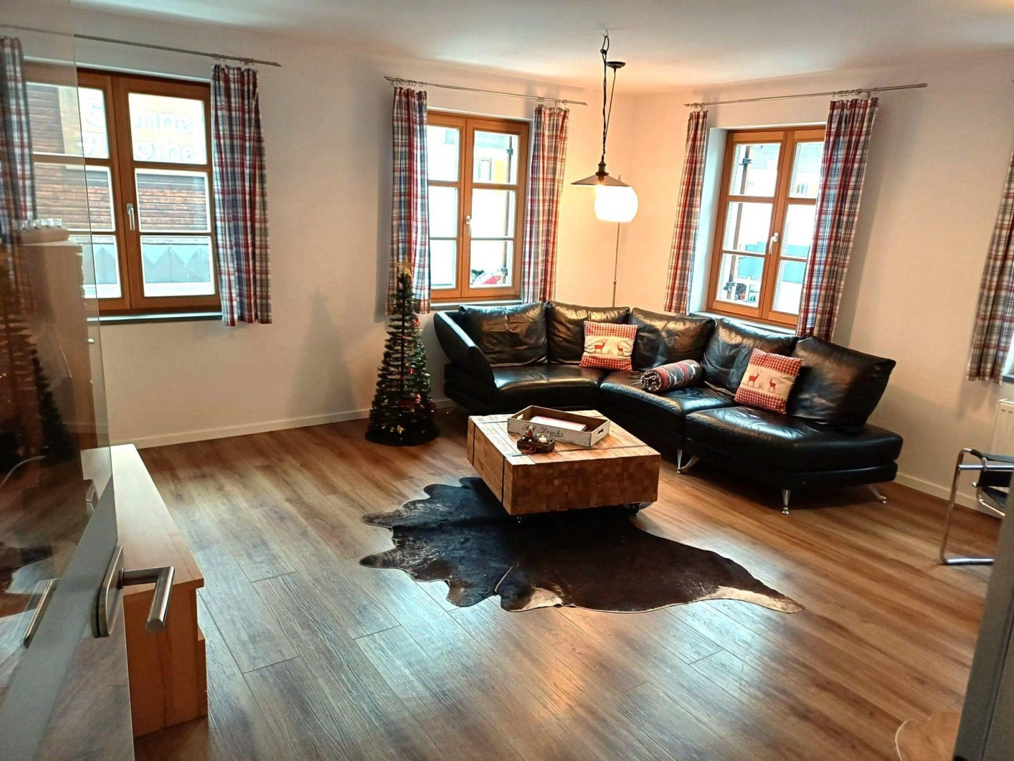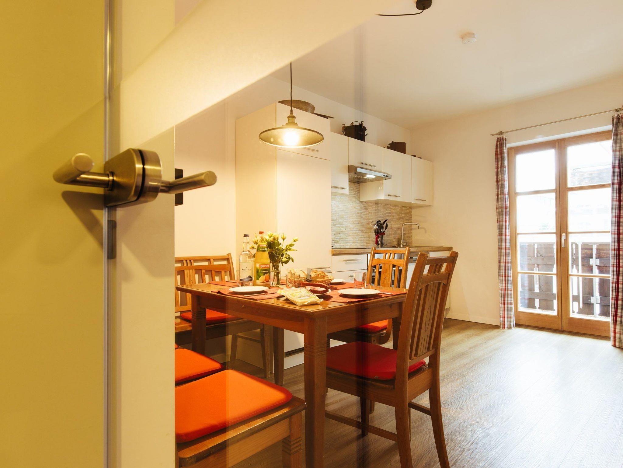 3 Zimmer, Küche, Bad Ferienwohnung mit 82 m² für 1 bis 4 Personen, 2 Schlafzimmern, Wohnzimmer, separate Küche mit Eckbank, 1. Obergeschoß, Südbalkon, Bergblick, Kinderzustellbett/-hochstuhl auf Anfrage möglich