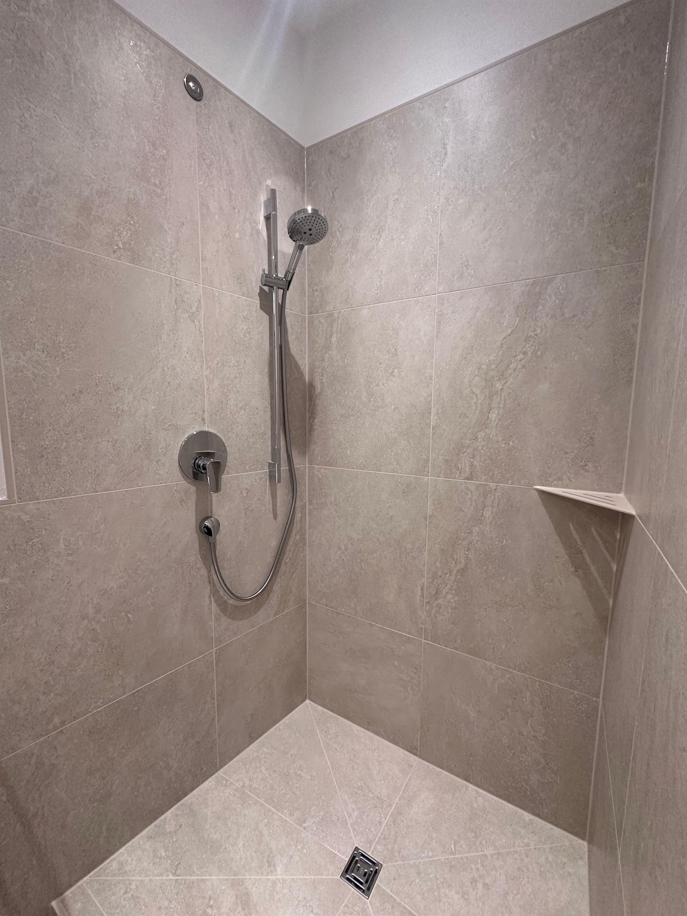 Das Badezimmer ist mit einer Dusche, WC und Waschbecken versehen.