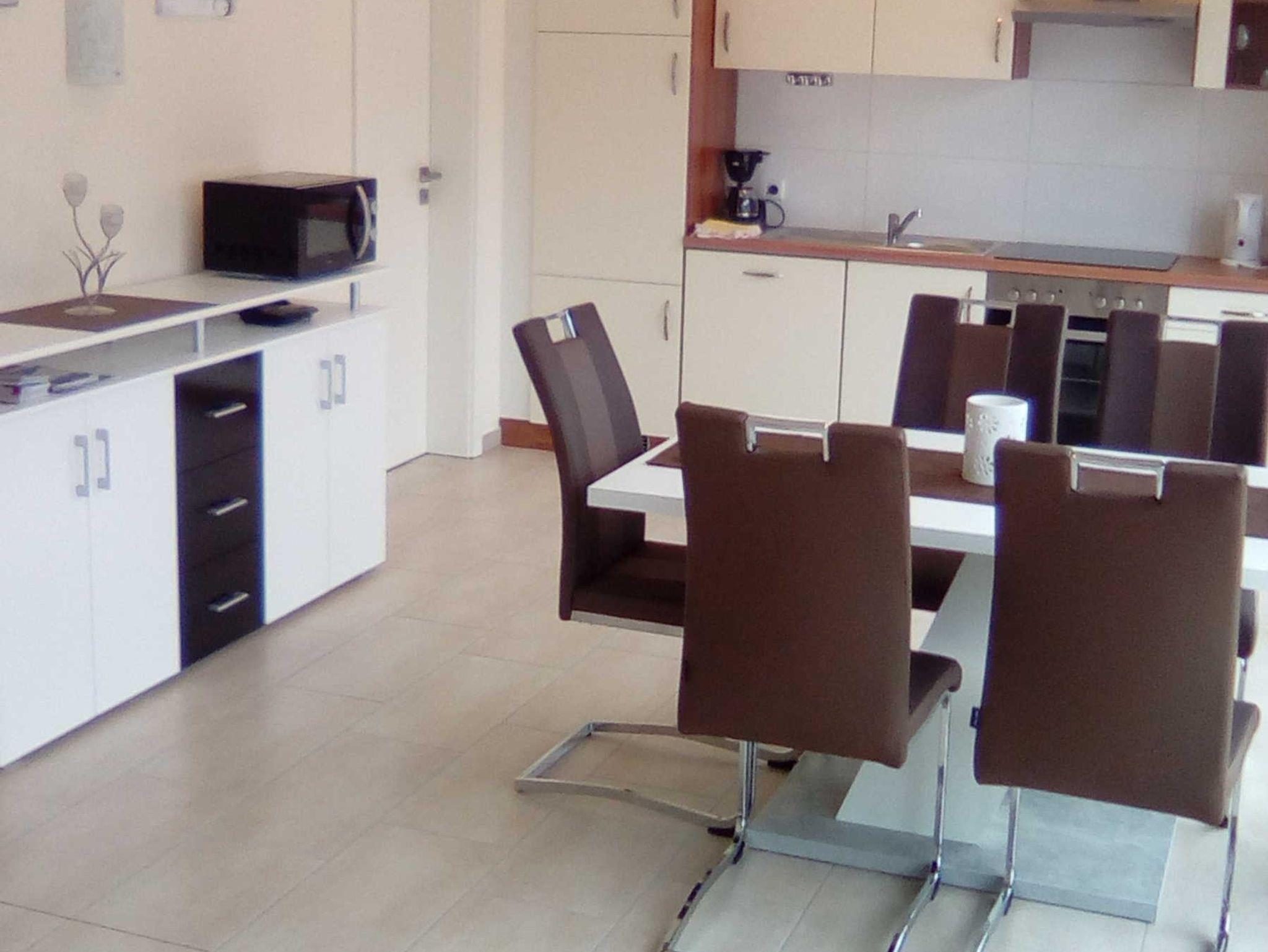 Unser Ferienhaus bietet Platz für 2-4 Personen und ein Kleinkind. Es besteht aus einem sonnigen, lichtdurchflutetem Wohnraum mit großer Fensterfront. Dieser ist eingerichtet mit einer gemütlichen Couchgarnitur einem schönen Essplatz für 6 Personen sowie einer komplett ausgestatteten Einbauküche. Außerdem hat das Haus 2 Schlafzimmer, eines davon mit Doppelbett, einem großen Schiebetürenschrank und Platz für ein Kinderbett (dies ist natürlich vorhanden). Das zweite Schlafzimmer ist eingerichtet mit 2 Einzelbetten und einem Kleiderschrank. Das Bad verfügt über eine bodentiefe Dusche mit Regenduschkopf, einem Handtuchheizkörper und natürlich einem Fön. Außerdem hat unser Ferienhaus kostenloses W-Lan und Telefon, Fußbodenheizug und elektrische Rollos im ganzen Haus sowie einen Flachbildfernseher mit Sat/TV. Vom Wohnraum gelangen sie direkt auf die große Terrasse, welche mit einer elektrischen Markise beschattet werden kann. Bettwäsche und Handtücher sind ebenfalls vorhanden.