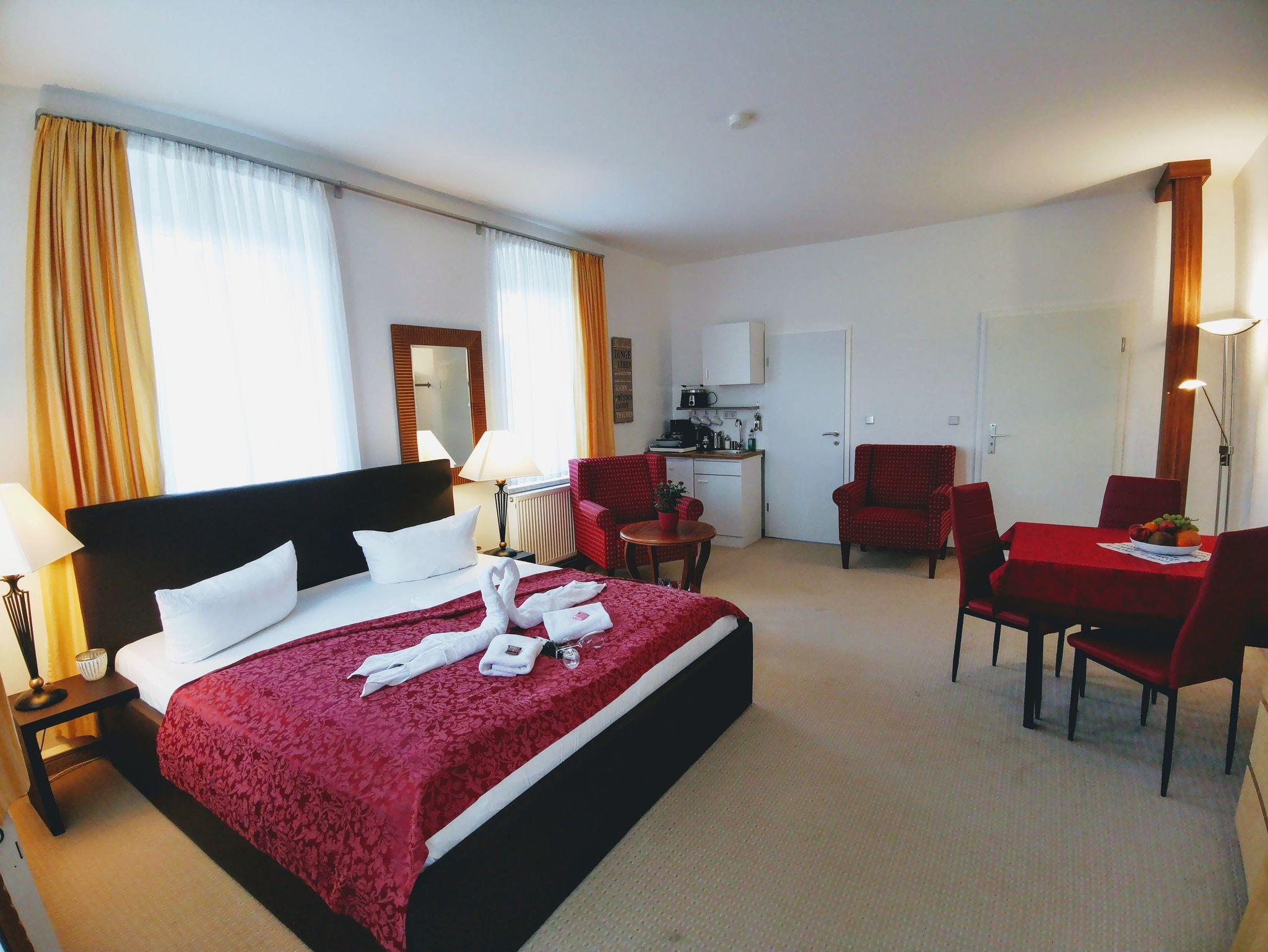 1-Zimmer-Apartments (23-27 qm) für bis zu 3 Personen mit kombiniertem Wohn- / Schlafraum. Die Apartments verfügen über kleine Kochnische mit einer Kaffeemaschine, Wasserkocher, einem Toaster und einem Kühlschrank, sowie einen Sitzbereich mit einem Flachbild-TV. Die Mikrowelle und/oder Backofen auf Anfrage.