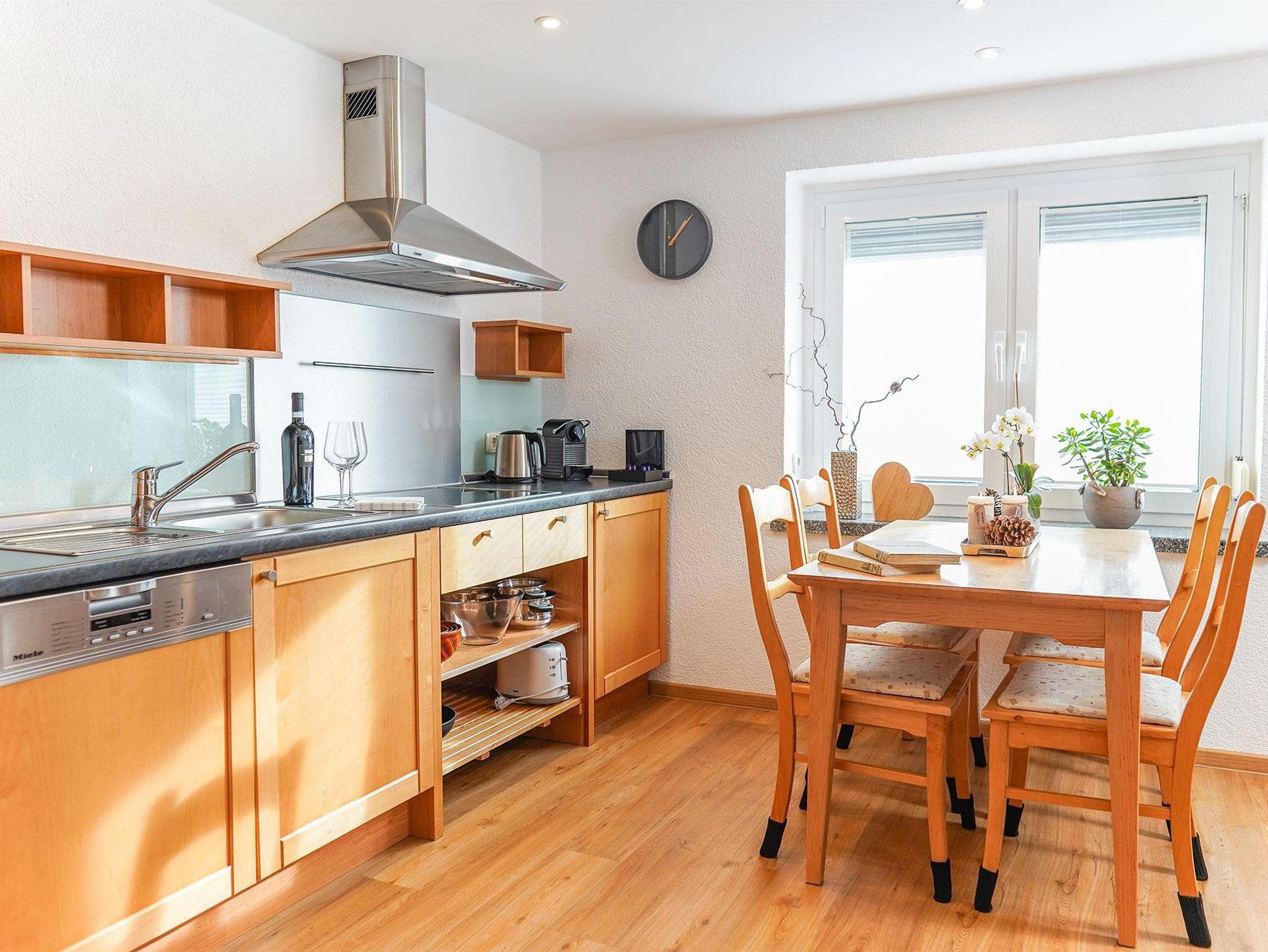35qm Grundfläche, 1 sep. Schlafzimmer,1 Wohnzimmer offen zur Küche, Polstercouch (Aufbettung) und Esstisch für 4 Pers., Flachbildschirm-Kabel-TV, Bad mit bodentiefer Dusche/WC/Fußbodenheizung, Küche komplett ausgestattet u.a. m. Kühlschrank m. Gefrierfach, Cerankochfeld, Kaffeemaschine, Wasserkocher, Toaster, Backofen u. Geschirrspüler, WLAN. Bettwäsche und Handtücher incl.,1 kostenfreier PKW-Stellplatz pro Wohnung im Hof.