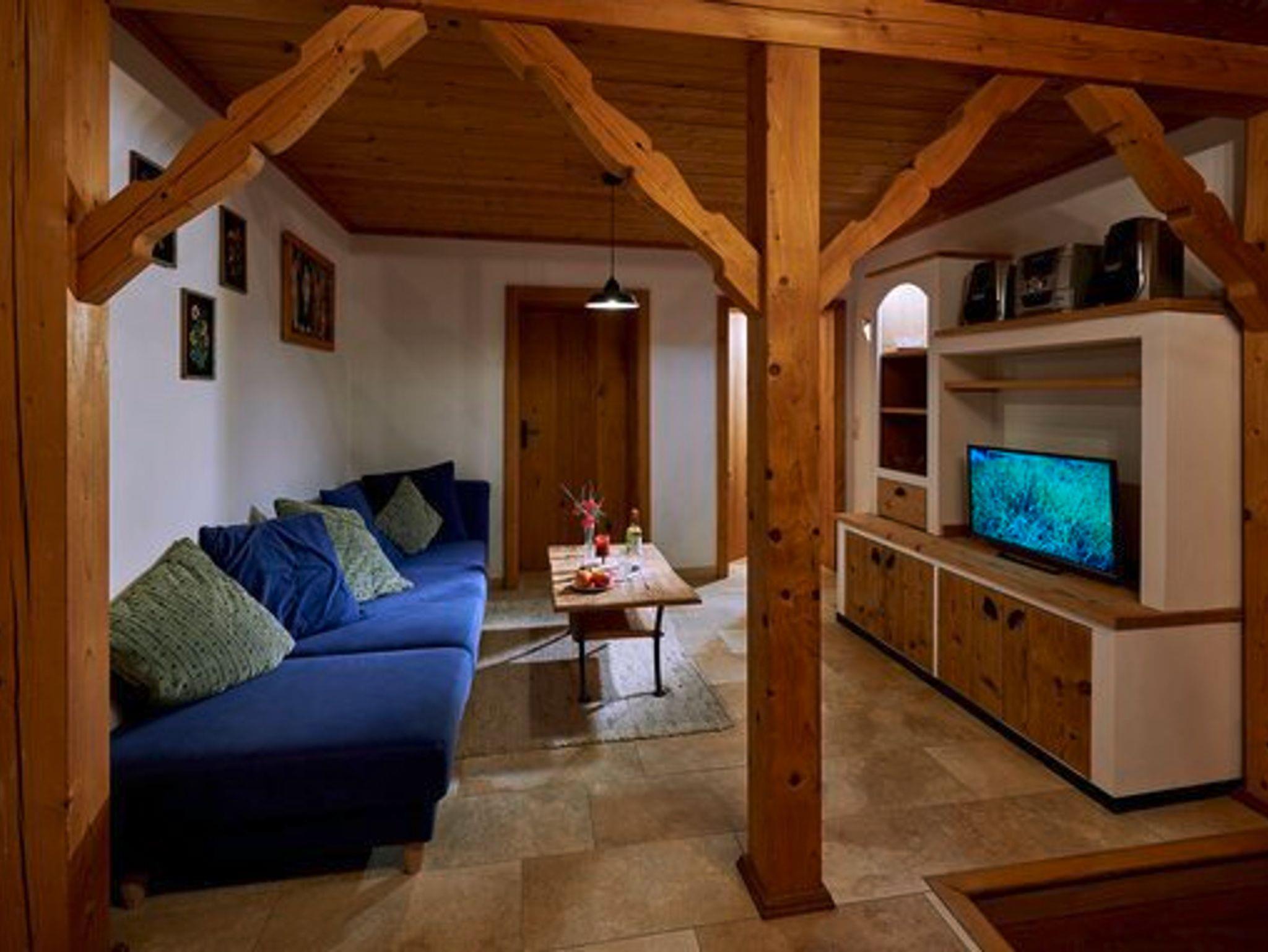 Die liebevoll ausgestattete 4-Sterne-Ferienwohnung Sonnenseite im 1. Obergeschoss verfügt über zwei Schlafzimmer. Die Nichtraucherwohnung ist ganz bequem über einen separaten Eingang zu erreichen. In der urigen Stube zieht der absolut kindersichere Kaminofen alle Blicke auf sich und sorgt in der kalten Jahreszeit für wohlige Wärme. Die Echtholzdecke, die handgeschmiedeten Beschläge, die Wanduhr aus Apfelbaumholz und das 100 Jahre alte Leinen vermitteln echtes Wohlfühlambiente und stehen in spannendem Kontrast zu den modernen Küchengeräten. Der große sonnige Balkon mit Balkonmöbeln und herrlicher Aussicht ins Grüne lädt dazu ein, das Familienfrühstück ins Freie zu verlagern.
