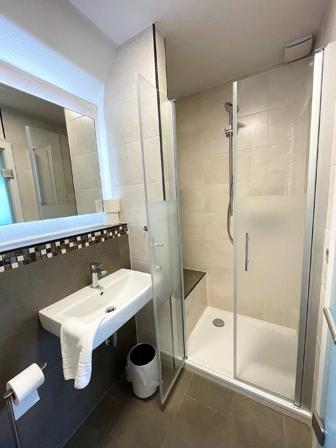 Das Badezimmer ist modern gestaltet und verfügt über eine bodengleiche Dusche, ein Waschbecken und ein WC.