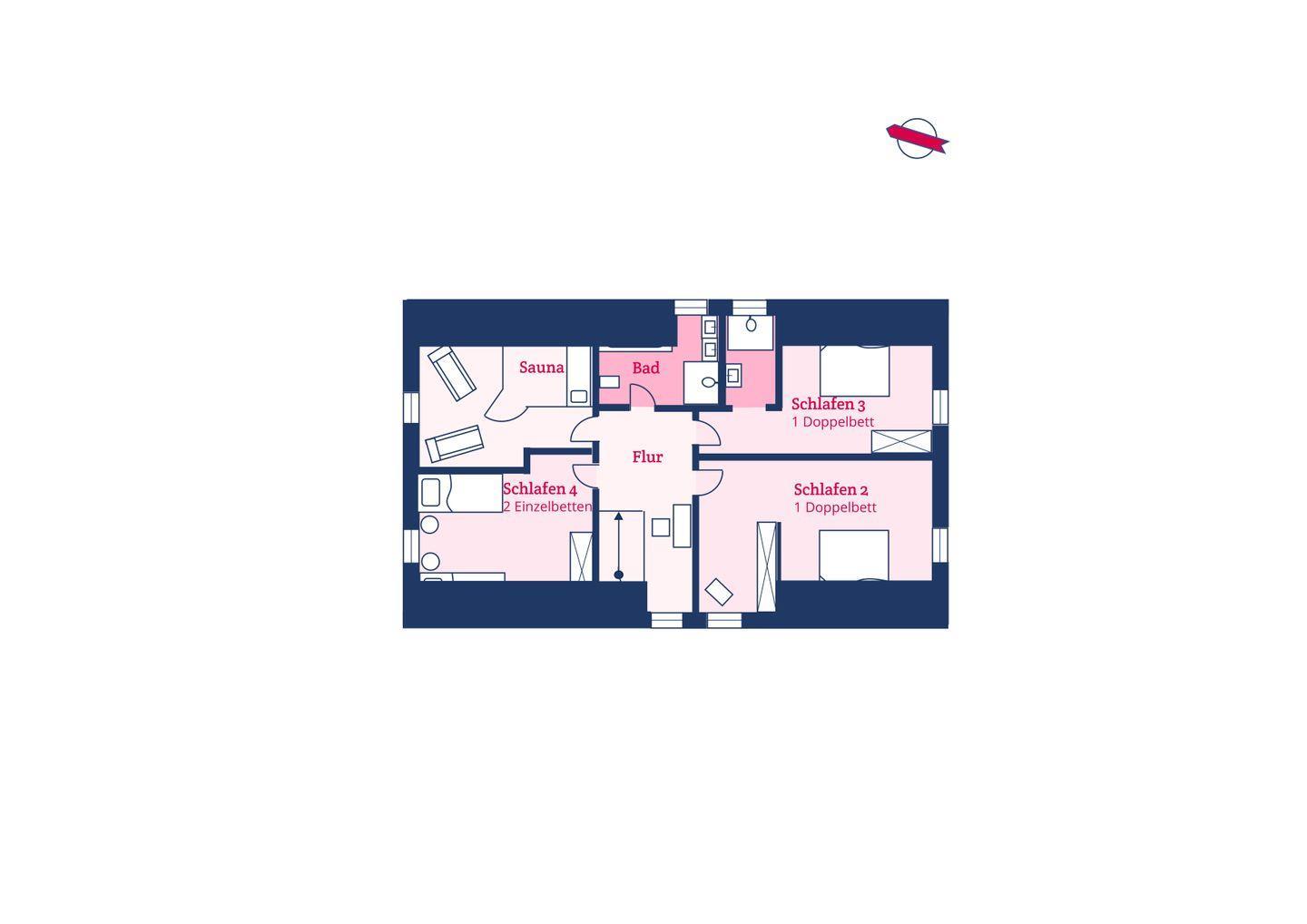 Über die Treppe erreichen Sie das 1. OG. Hier befinden sich drei weitere Schlafzimmer, eins davon ist ebenfalls mit einem Smart-TV ausgestattet. Das Saunazimmer verfügt über eine hochwertige Sauna samt Liegebereich. Das Badezimmer ist mit einer Dusche und einer Badewanne ausgestattet. In allen Schlafzimmern befinden sich Doppelbetten und Einbauschränke, welche vom Tischler angefertigt wurden.