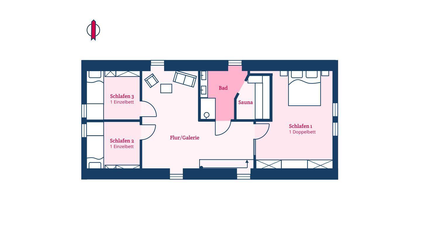 Im gesamten Obergeschoss mit der beeindruckenden Deckenhöhe sind 3 weitere Schlafzimmer untergebracht - eins mit Doppelbett und zwei mit Einzelbett. Zudem befindet sich hier das Bad mit der Sauna und im offenen Flur lädt ein gemütlicher Sitzbereich mit Flachbild-TV zum Relaxen ein.