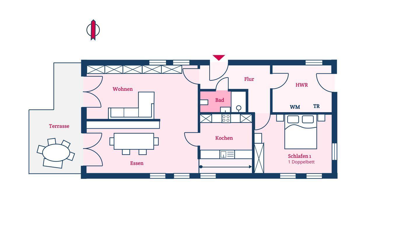 Im Erdgeschoss befindet sich das Herzstück des Hauses: der großzügige Wohn-/Essbereich mit Gaskamin und Sofalandschaft. Gleich nebenan liegt die voll ausgestattete Küche. Ein Schlafzimmer mit Doppelbett, ein Bad mit bodengleicher Dusche und der Hauswirtschaftsraum mit Waschmaschine und Trockner befinden sich ebenfalls im Erdgeschoss.