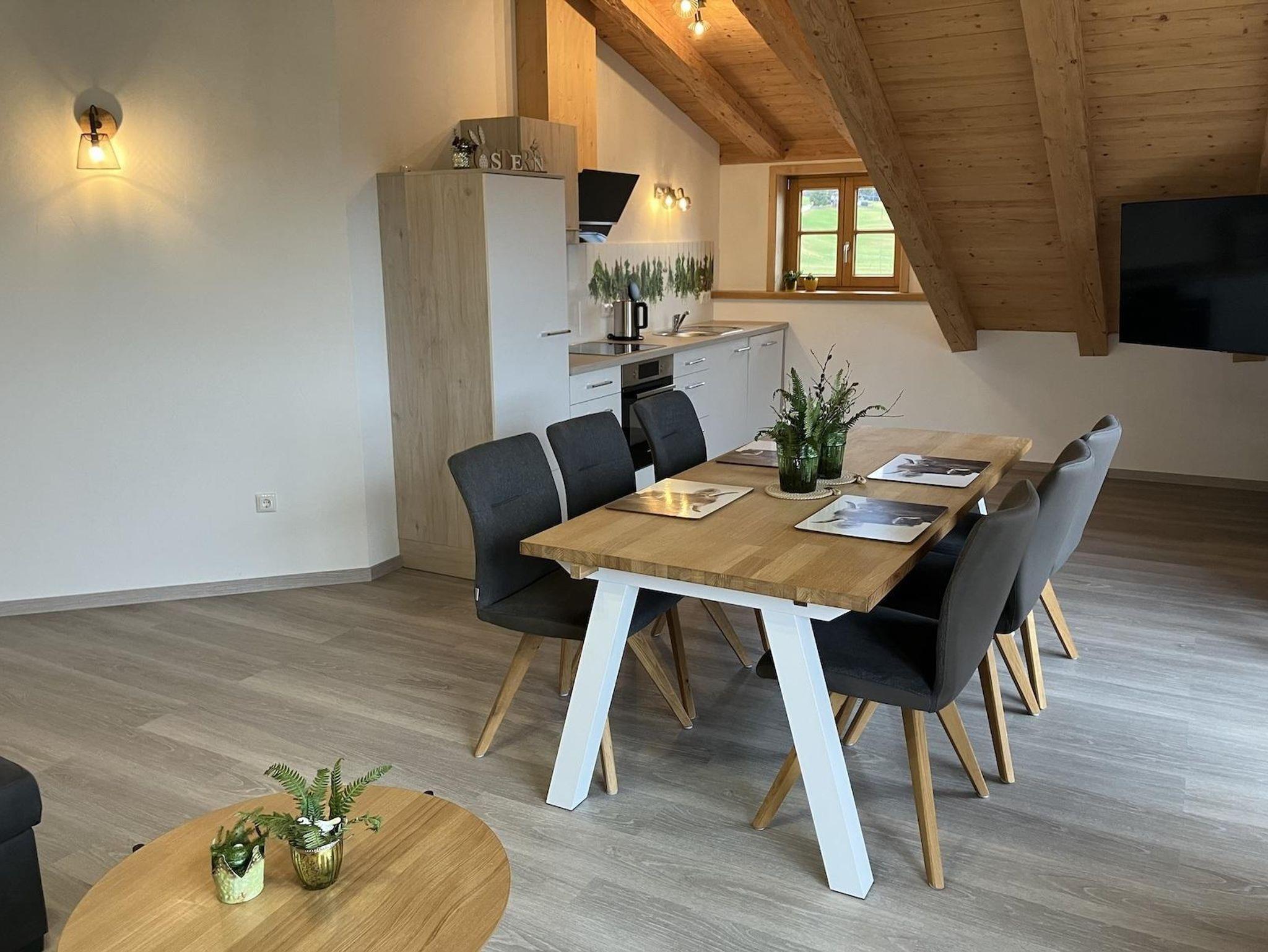 Willkommen in unserer mit viel Liebe eingerichteten Ferienwohnung „Sunnewieble“. Mit einem hellen Schlafzimmer mit Westbalkon, einem Bad mit Regenwalddusche sowie einem einladenden Wohn-/Essbereich mit Südbalkon bietet die Wohnung Platz für zwei Personen. Ein Kind bis zwei Jahre ist auf Anfrage gerne möglich. Durch die alpenländische Gestaltung erhält die helle Wohnküche ihren besonderen Charme, der zum gemütlichen Beisammensein einlädt. Vom sonnigen Südbalkon aus können Sie den ganzen Tag das Bergpanorama der Allgäuer Alpen genießen.