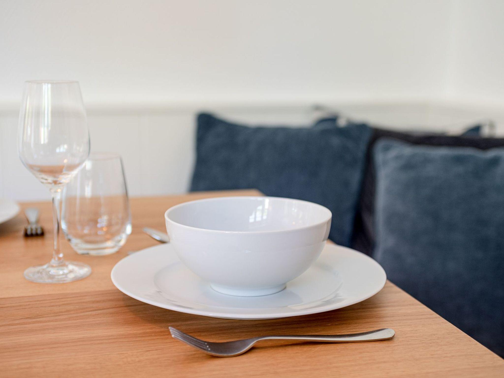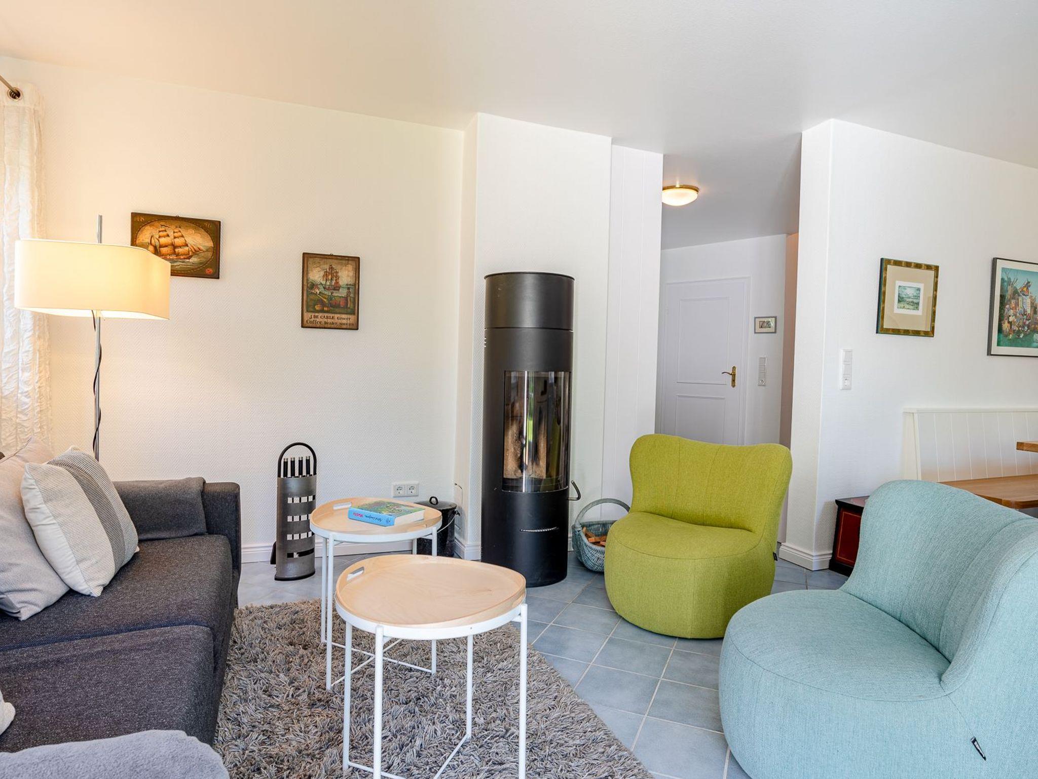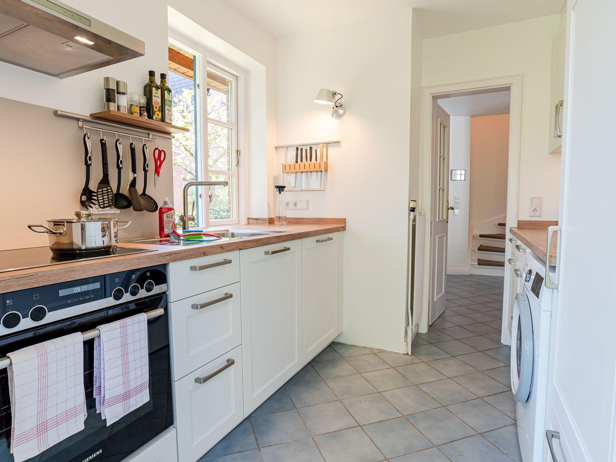 Im Erdgeschoss befindet sich eine kleine Diele mit Garderobe, ein Gäste-WC, das lichtdurchflutete Wohnzimmer mit dänischem Kaminofen und gemütlichem Essplatz mit Eckbank. In der Küche finden Sie u. a. einen Geschirrspüler, den Herd mit Cerankochfeld und Umluftbackofen, einen Kühlschrank mit Gefrierfach. Zur Ausstattung gehören ebenfalls eine Nespressomaschine (Kapseln können Sie käuflich erwerben), ein Toaster, der Wasserkocher und ein Handrührer wie auch Pütt und Pann für das Kochen und Backen. Das Geschirr, die Gläser und das Besteck sind in ausreichender Menge vorhanden.
