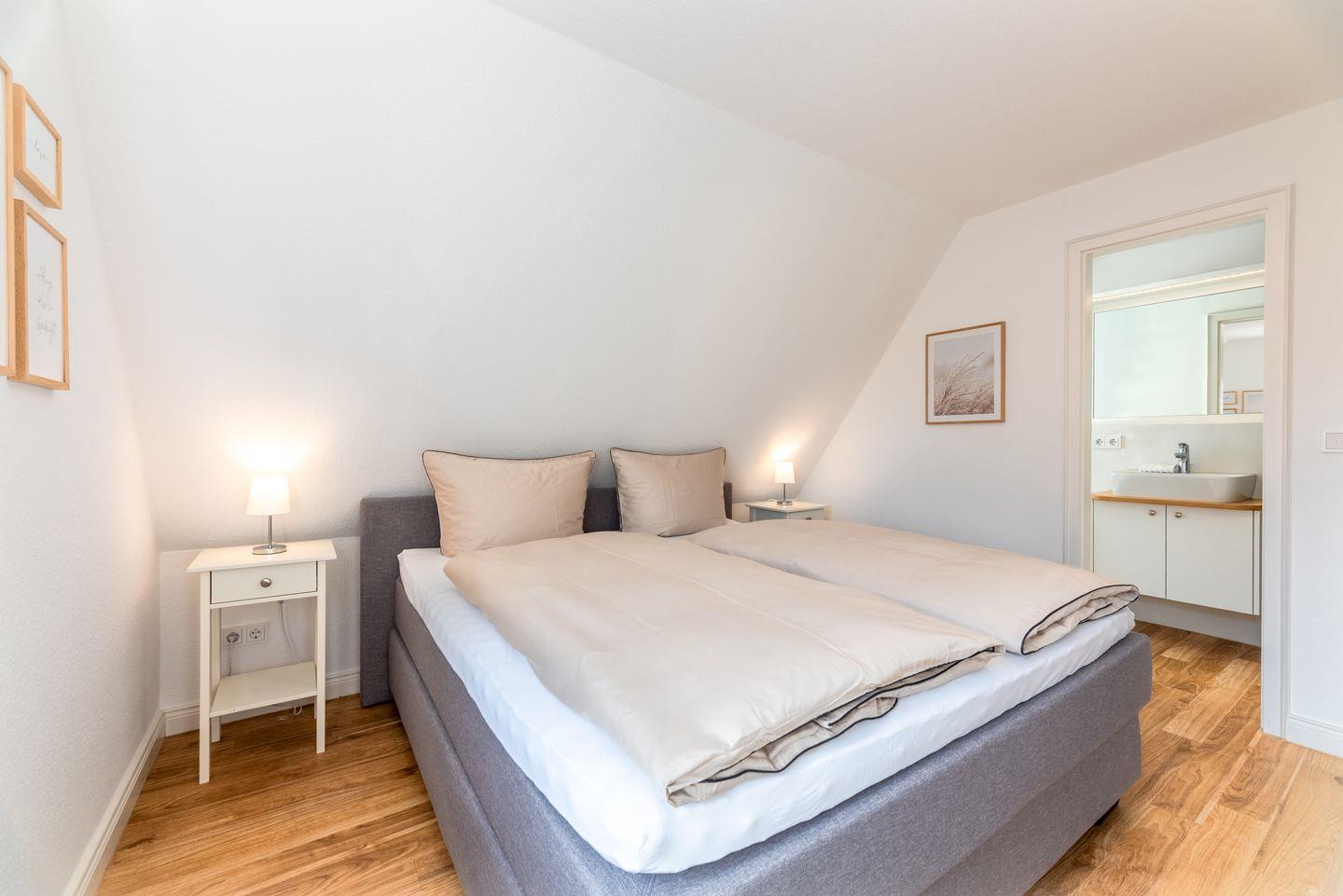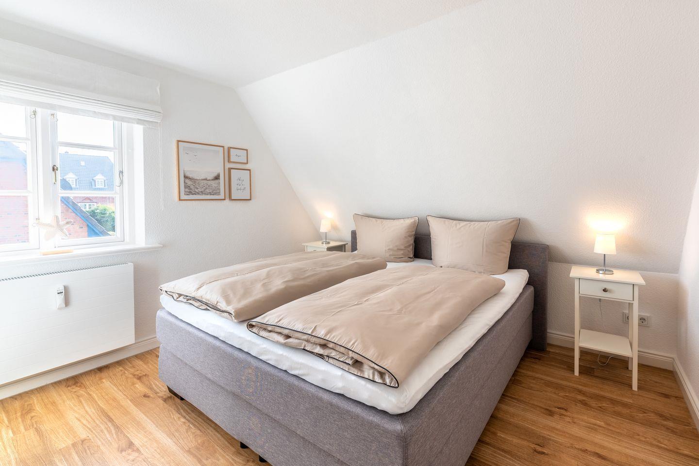 Zwei liebevoll gestaltete Schlafzimmer im Obergeschoss sorgen für erholsamen Schlaf. Das moderne Duschbad verfügt über eine Dusche und ein Fenster sowie eine Fußbodenheizung.