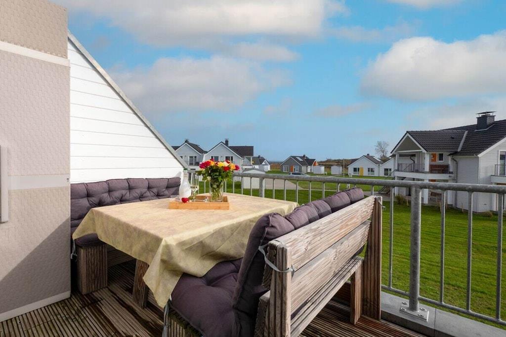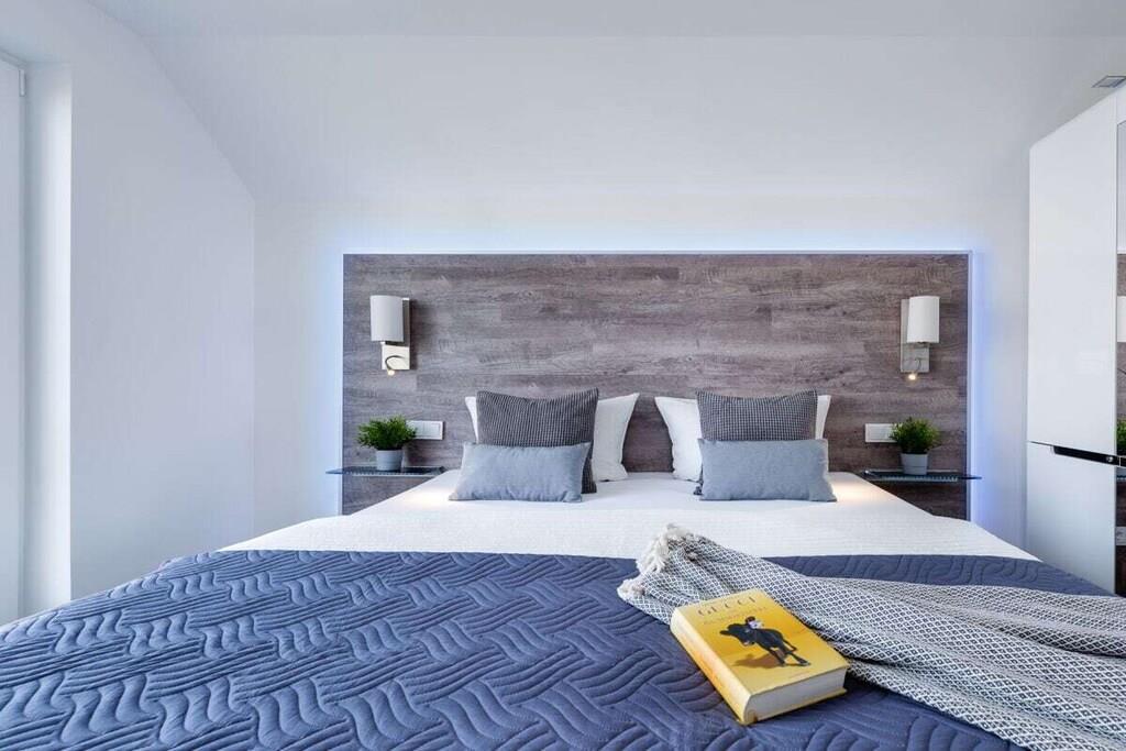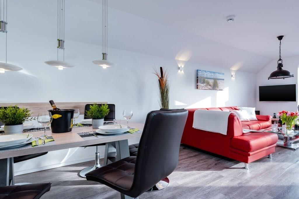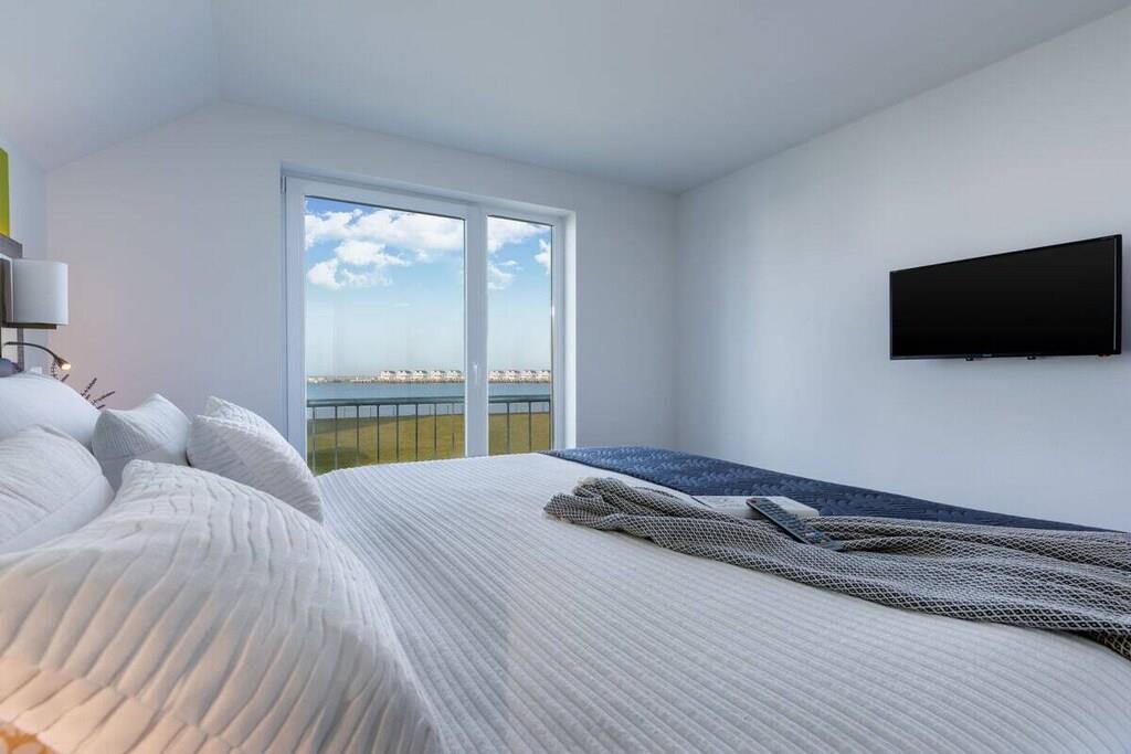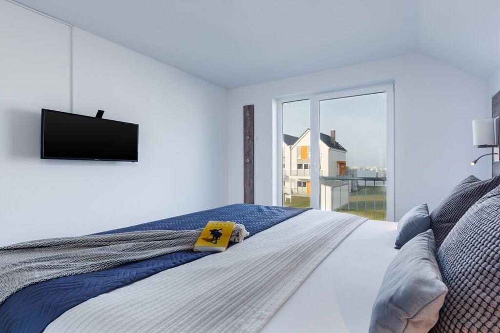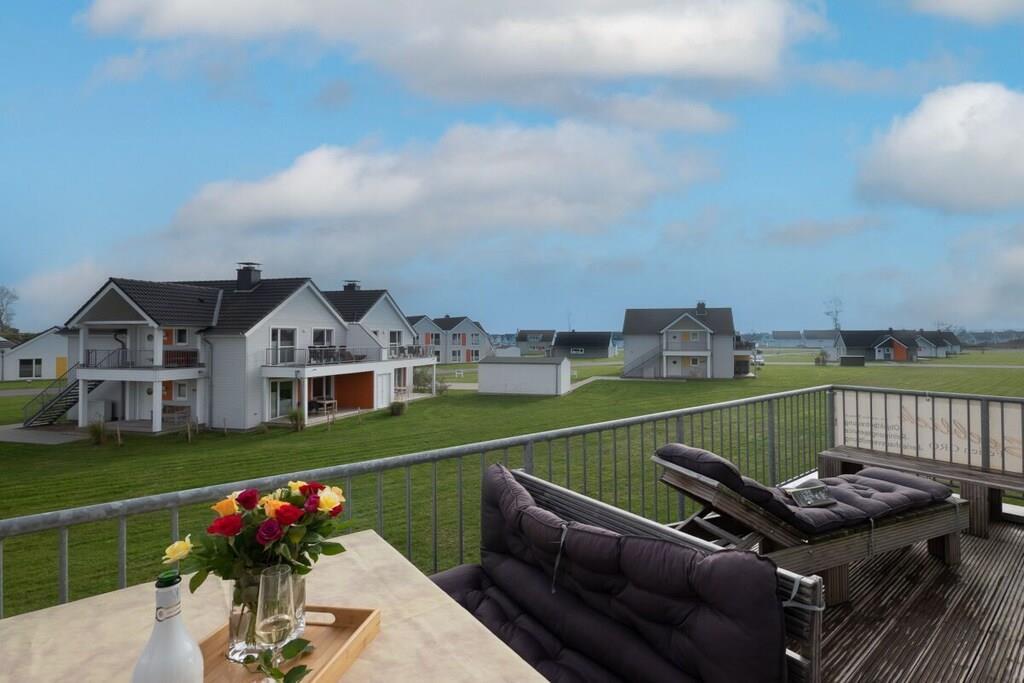 Direkt vom Eigentümer. Idyllisch auf der Kapitäns-Halbinsel des Ostsee Resort Olpenitz, in der Kapitänsstraße gelegen, bietet unsere 3 Zimmer “Fewo Kapitän James Cook Olpenitz” von allen "Sternhäusern“ hier den mit Abstand schönsten Blick und die beste Lage, einen Anlaufpunkt für Erholungsurlaub auf 77m² in der ersten Etage. Die Fewo Käpt`n James Cook Olpenitz betritt man über eine Außentreppe zum überdachten ersten Balkon (10m²), dieser ermöglicht auch bei Regen, den Aufenthalt an der frischen Luft. Der Eingangsbereich führt vorbei an einem schönen Badezimmer, dies lässt Wellnessherzen höher schlagen, denn es verfügt über eine ebenerdig geflieste Walk In Dusche und über eine Sauna (Infrarotkabine) mit Farbblichttherapie. Auf der anderen Seite folgen zwei geschmackvoll eingerichtete Schlafzimmer mit Platz für vier Erwachsene und einen traumhaften Blick auf`s Wasser. Das Masterbedroom verfügt über ein Wasserbett mit mittlerer Beruhigung (1,80 x 2,20), während ein Boxspringbett (1,80 x 2,00) im zweiten Schlafzimmer, bei mit zusätzlichem Flat TV, auf Sie wartet. Im Fokus steht aber der perfekt umgesetzte lichtdurchflutete Wohn- und Essbereich mit Holz befeuertem Kaminofen, bodentiefen Fenstern, durch die sich der Wohnbereich mit der Natur verbindet. Die Integration der offenen Küche mit hervorragender Ausstattung und funktionalem Design, steht dem gemütlichen Beisammensein,auch beim zubereiten von allerlei Köstlichkeiten nichts, im Wege. Der runde Kaminofen zwischen Wohnzimmer und Essbereich verleiht dem Raum eine besondere Atmosphäre. Vor allem in den kalten Wintertagen verbreitet der Ofen ein kuscheliges Wohlfühlambiente mit angenehmer Wärme. Den großzügigen zweiten Balkon (Südbalkon14m²) betritt man über den Wohnbereich. Hier können es sich unsere Gäste auf einer bequemem Bestuhlung gemütlich machen und die Sonne so zu jeder Tageszeit genießen oder sich etwas leckeres auf dem Elektrogrill zubereiten. Bei dieser Wohnung sind spektakuläre Sonnenlichtspiele durch die zwei Balkone in Süd- und Westausrichtung zu erwarten. Der Einrichtungsstil entspricht der exklusiven Lage der Ferienwohnung: klare Farben und Formen, sowie der Einsatz natürlicher Materialien, versprechen Ruhe und Rückzug, während einzelne Farbakzente für erfrischende Leichtigkeit sorgen. Die gesamte Ferienwohnung lässt sich über die Fußbodenheizung einfach temperieren und bietet dank des Kaminofens und der Sauna das ganze Jahr über eine angenehme Wärme und eine gemütlich-wohlige Atmosphäre. Für Unterhaltung sorgen im Wohnbereich eine Musik-Anlage mit Bluetooth, Wlan, CD, SD und USB Slot, sowie eine Spielesammlung und Bücher. Darüber hinaus verfügt die Wohnung über einen Pkw-Stellplatz mit Elektroladesäule direkt am Haus. Bettwäsche/ Handtücher können selbst mitgebracht oder aber in Form von Wäschepaketen (ca.EURO 21,-p.Paket) ausgeliehen werden. Die Betten wären dann bei Anreise bezogen. Der Buchungskalender hier auf Traum Ferienwohnungen ist immer TOP Aktuell. Buchungslücken sind buchbar (auch nur eine Übernachtung). Schreiben Sie uns unverbindlich an.