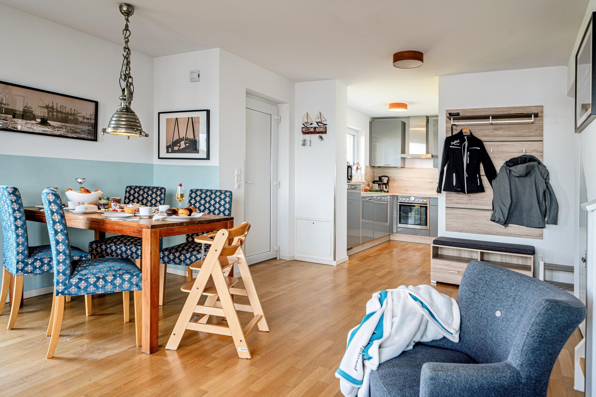 Das Herzstück des Ferienhauses Am MEER ist der offen gestaltete Wohnbereich im Erdgeschoss. Hier können Sie den direkten Meerblick und gemütliche Kaminabende in einer stilvollen Kombination aus Ess- und Wohnzimmer genießen. Durch die großzügigen Fensterfronten eröffnet sich Ihnen ein einmaliger Ausblick auf die Ostsee, der zu jeder Tageszeit begeistert. Es versteht sich bei dieser Einrichtung von selbst, dass hier Echholzfussböden verlegt wurden.