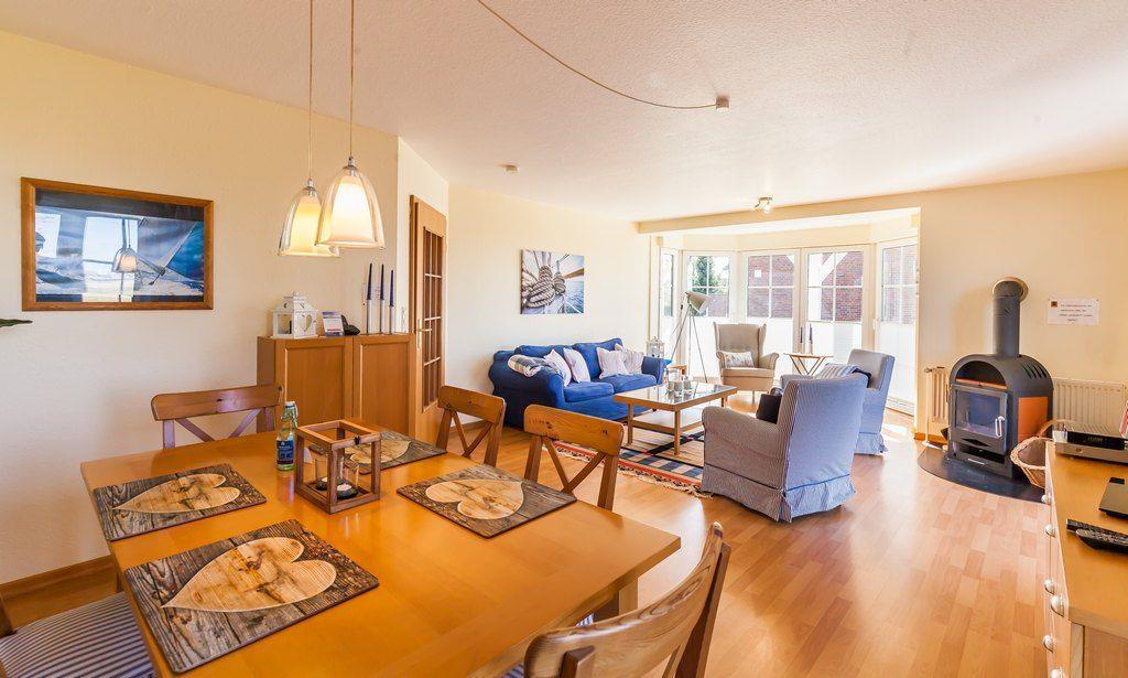 Die Ausstattung umfasst einen Wohn- und Essraum mit Schlafsofa für 2 Personen, zwei Doppel-Schlafzimmer, eine großzügige Einbauküche mit Spüle, Ceranfeld, Backofen, Kühlschrank, Geschirrspüler und Waschmaschine, sowie ein Duschbad/WC.