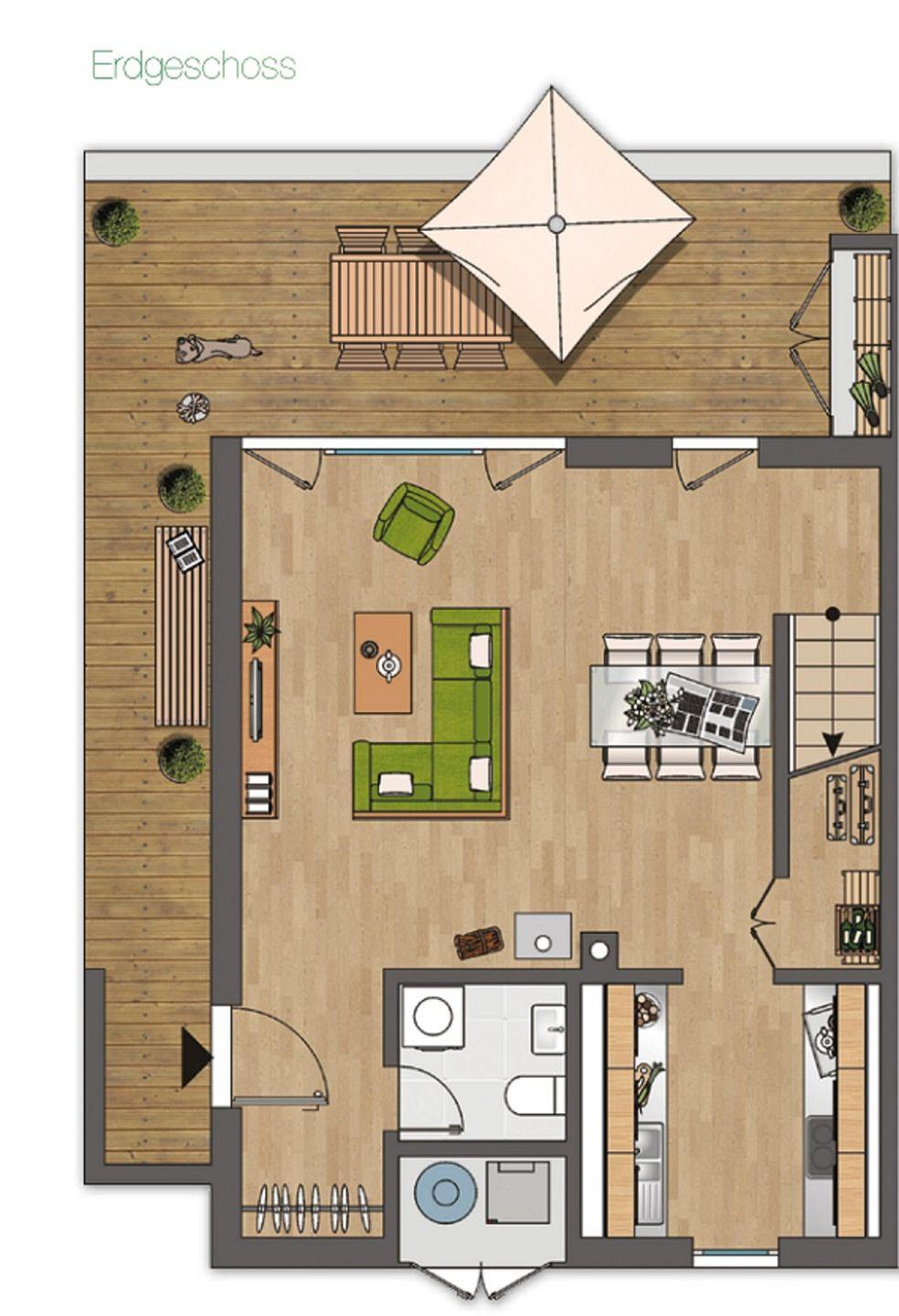 Der Wohn- und Essbereich bietet einen Blick auf den Hafen. Die Küche ist voll ausgestattet. Beide Schlafzimmer haben Wasserblick. Ein Highlight des Hauses ist das Studio, das mit einer Schlafcouch ausgestattet. Vom Studio aus erreichen Sie die Dachterrasse sowie Sauna und Dusche. Die Whirlwanne im Badezimmer verspricht Entspannung pur.