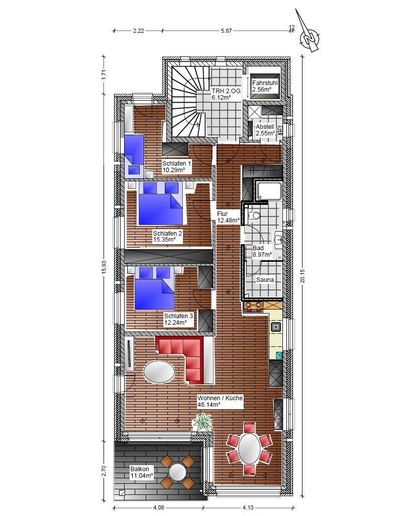 Auf dem großen Südbalkon warten bequeme Bestuhlung und zwei hochwertige gepolsterte Sonnenliegen auf unsere Gäste.