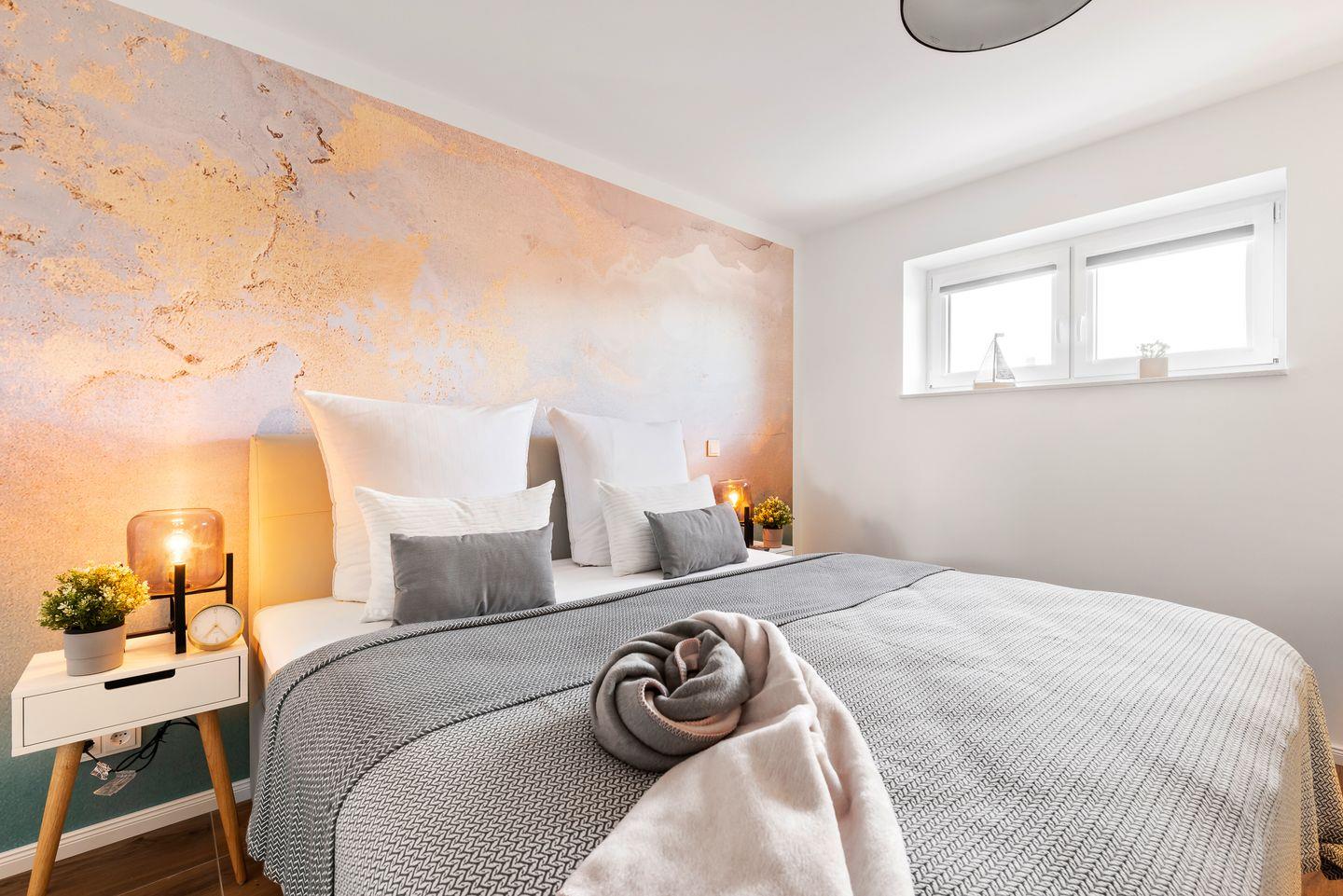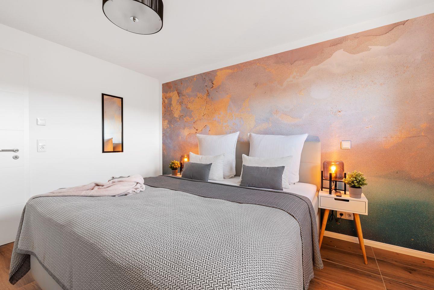 Zwei große Schlafzimmer mit integrierten Kleiderschränken, hochwertigen Boxspringbetten, Schreibtisch und Smart-TV bieten die perfekte Erholung in der Nacht. Das liebevoll eingerichtete Einzelzimmer ist mit Kinderspielzeug, einem Kleiderschrank und kindgerechten Bildern ausgestattet.