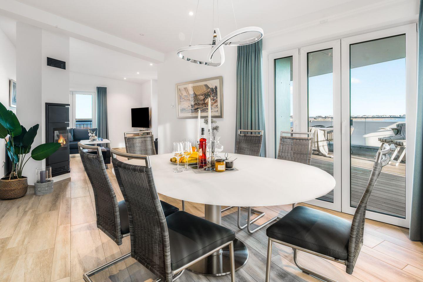 Der offen gestaltete, lichtdurchflutete Wohn- und Essbereich lädt zu kulinarischen und geselligen Abenden ein. Am großen Esstisch finden 8 Personen bequem Platz. So können Sie beim Dinner den Blick über das Wasser durch die riesigen Panoramafenster genießen. Die Küche lässt keine Wünsche offen, sie ist rundum ausgestattet und bietet Hobbyköchen Komfort in Ausstattung und Design. Vom Frühstücken in der Morgensonne bis hin zum gemeinsamen Sundowner auf der fast 44 m² großen Dachterrasse mit Blick auf den Hafen, die Schlei und die Ostsee ist alles möglich.