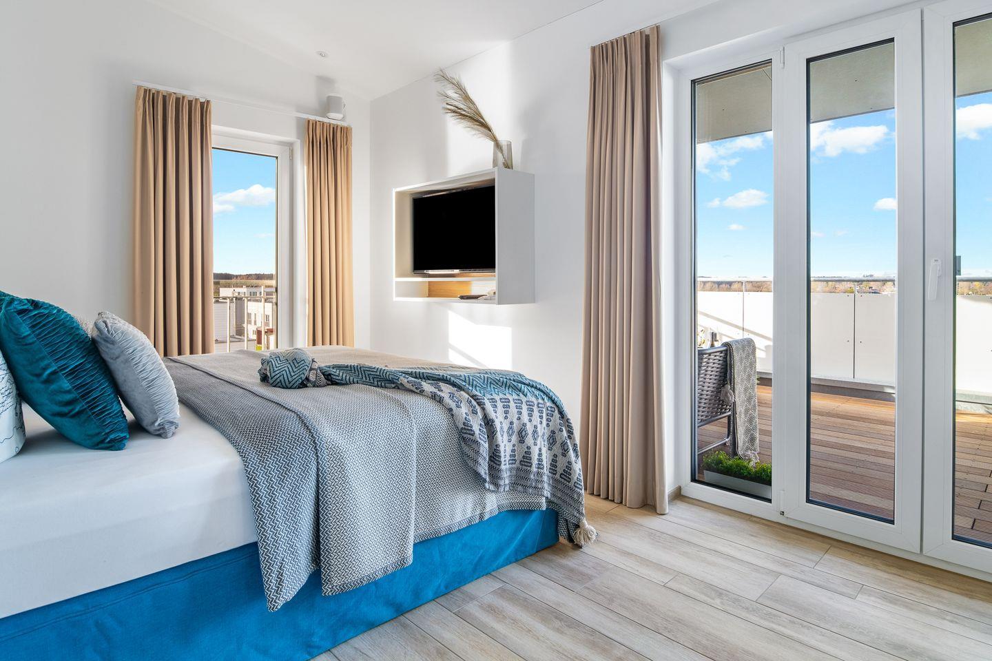 Die Schlafzimmer punkten allesamt mit dem wunderschönen Blick auf das Wasser. Zwei von den insgesamt vier Schlafzimmern haben direkten Zugang zu den beiden Dachterrassen (22 m² und 44 m²). Beim morgendlichen Kaffee lässt sich der Sonnenaufgang und der Schiffverkehr beobachten. Für die perfekte Entspannung stehen dort zwei gemütliche Lounge Möbel. Drei Schlafzimmer verfügen über 1,80m große Boxspringbetten. Das vierte Schlafzimmer ist mit einer Schlafcouch für bis zu zwei Personen ausgestattet.