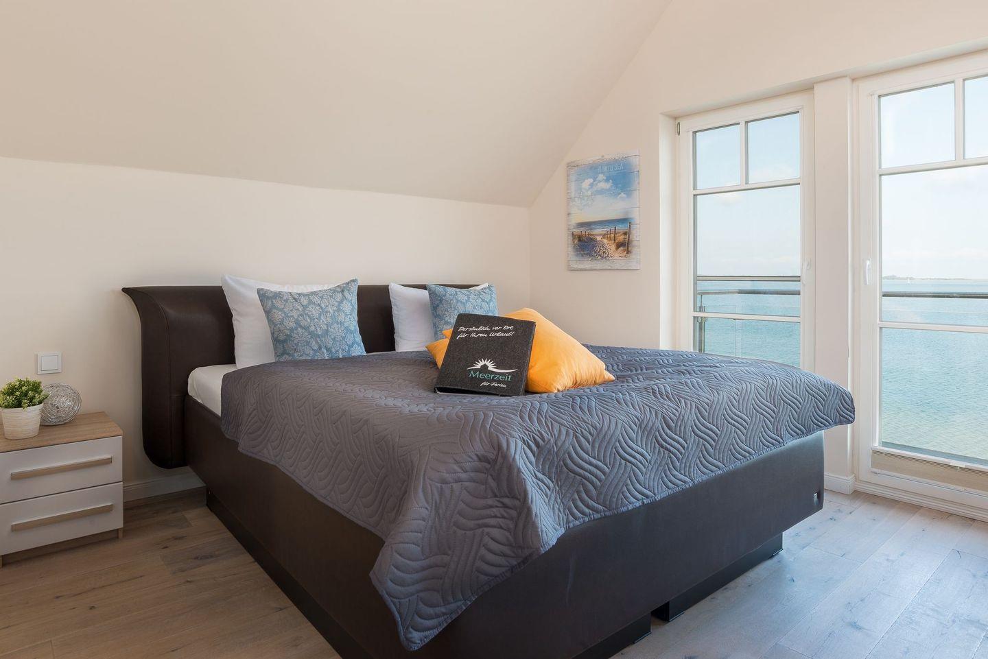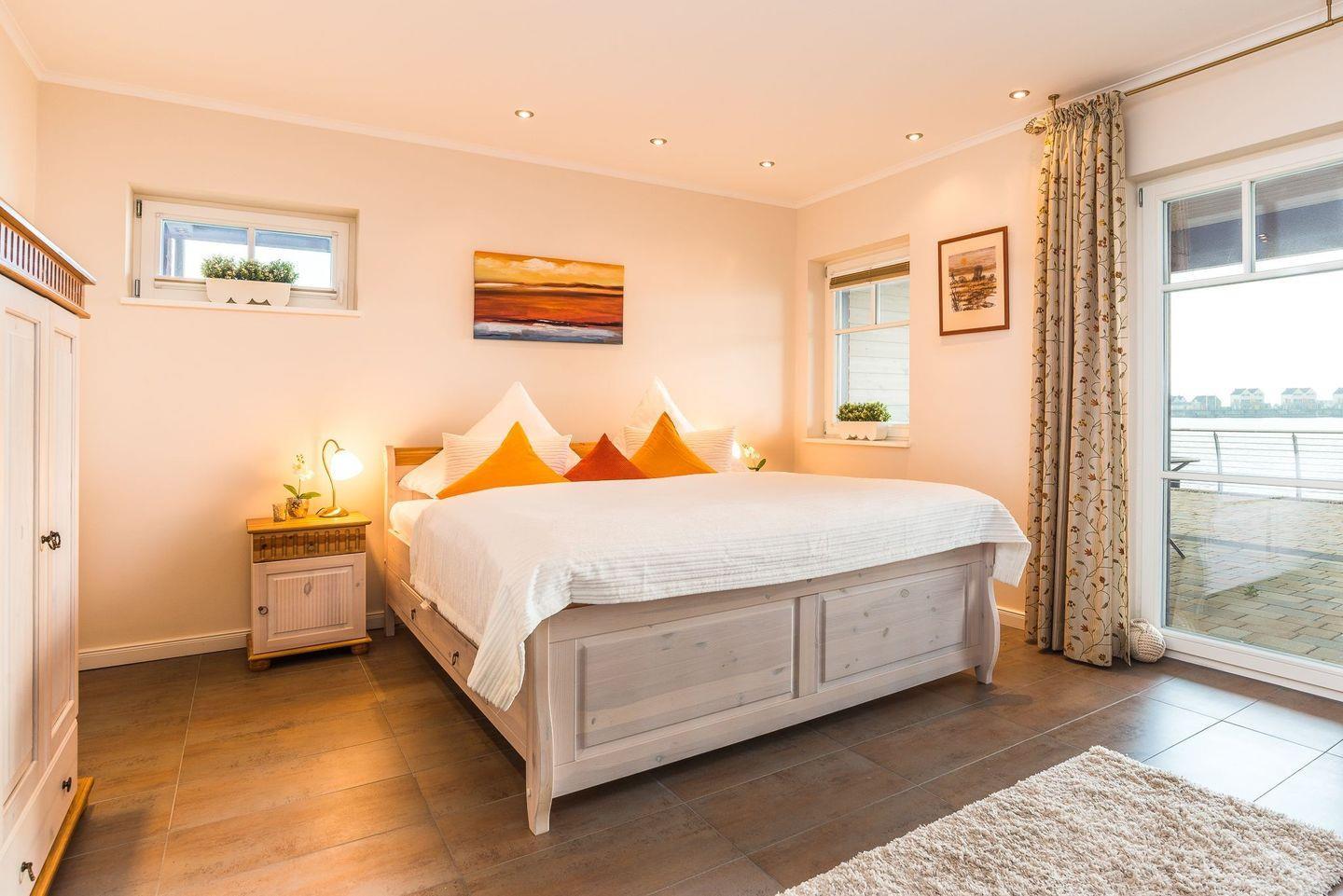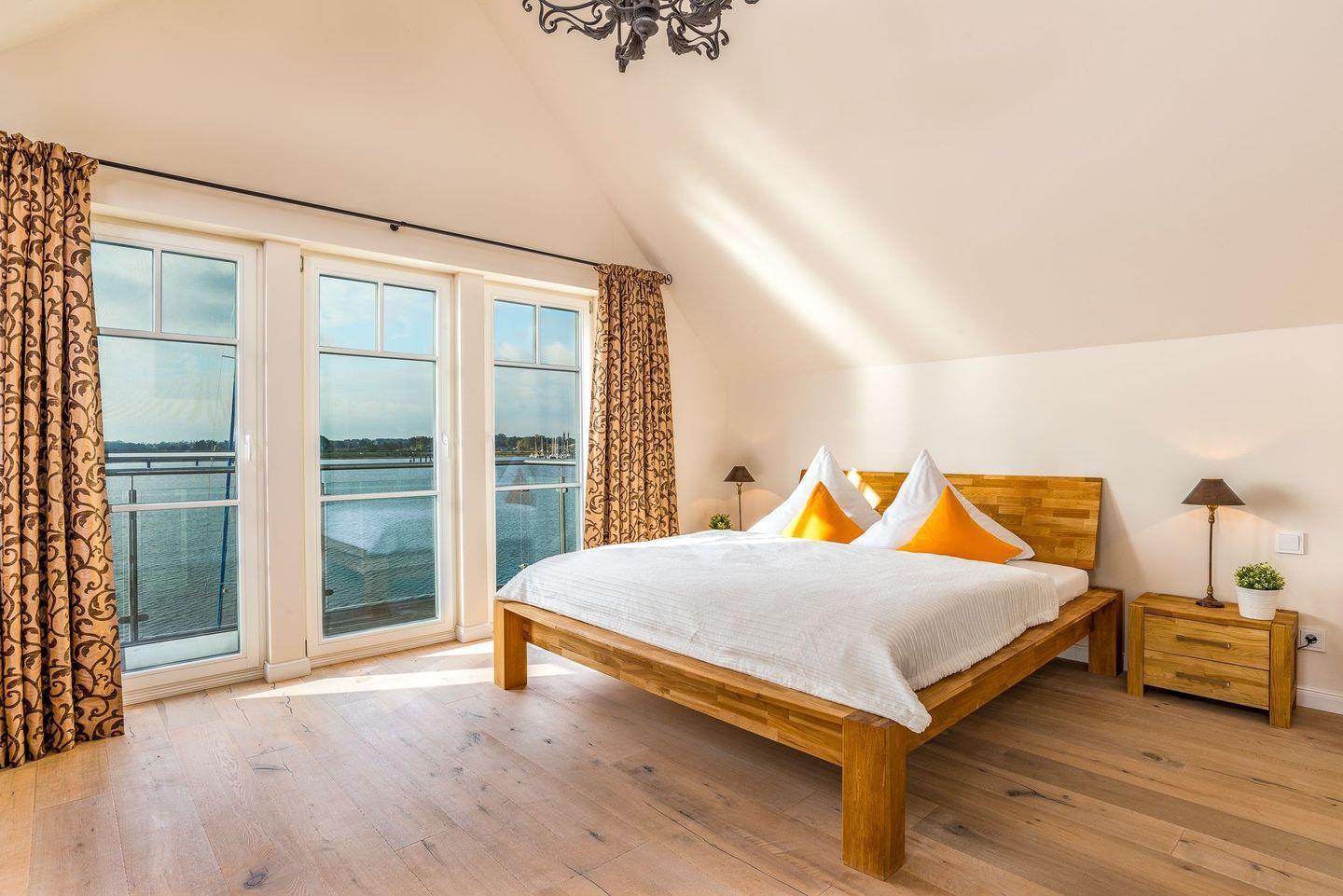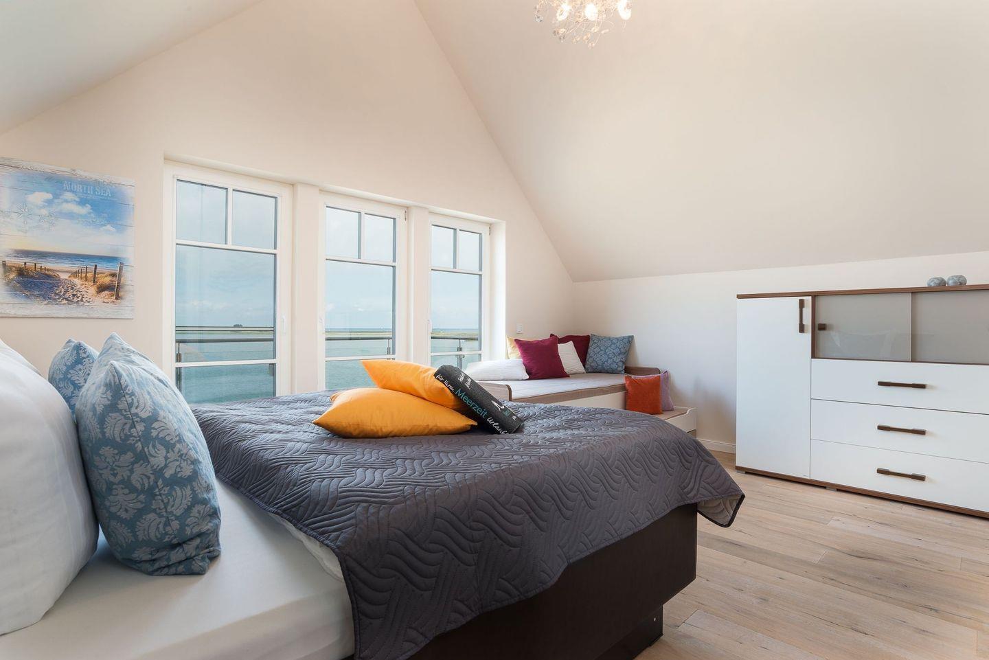 Im Dachgeschoss mit insgesamt 53 qm sind zwei weitere Schlafzimmer, wovon das eine ein zusätzliches ausziehbares Einzelbett vorhält. Kleiderschränke oder Kommoden sind in allen Schlafzimmern vorhanden. Das Schlafzimmer zur Hafenseite verfügt zudem über einen weiteren Fernseher.