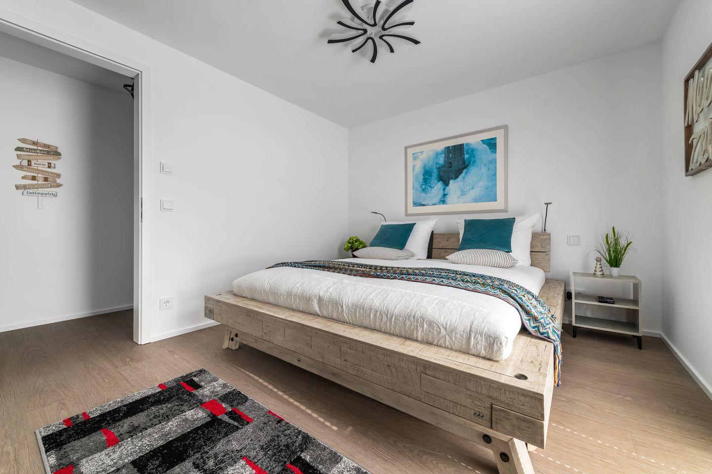 Das Schlafzimmer ist mit einem komfortablen Doppelbett (180x200cm), hochwertigen Kleiderschränken und einem Smart-TV ausgestattet.