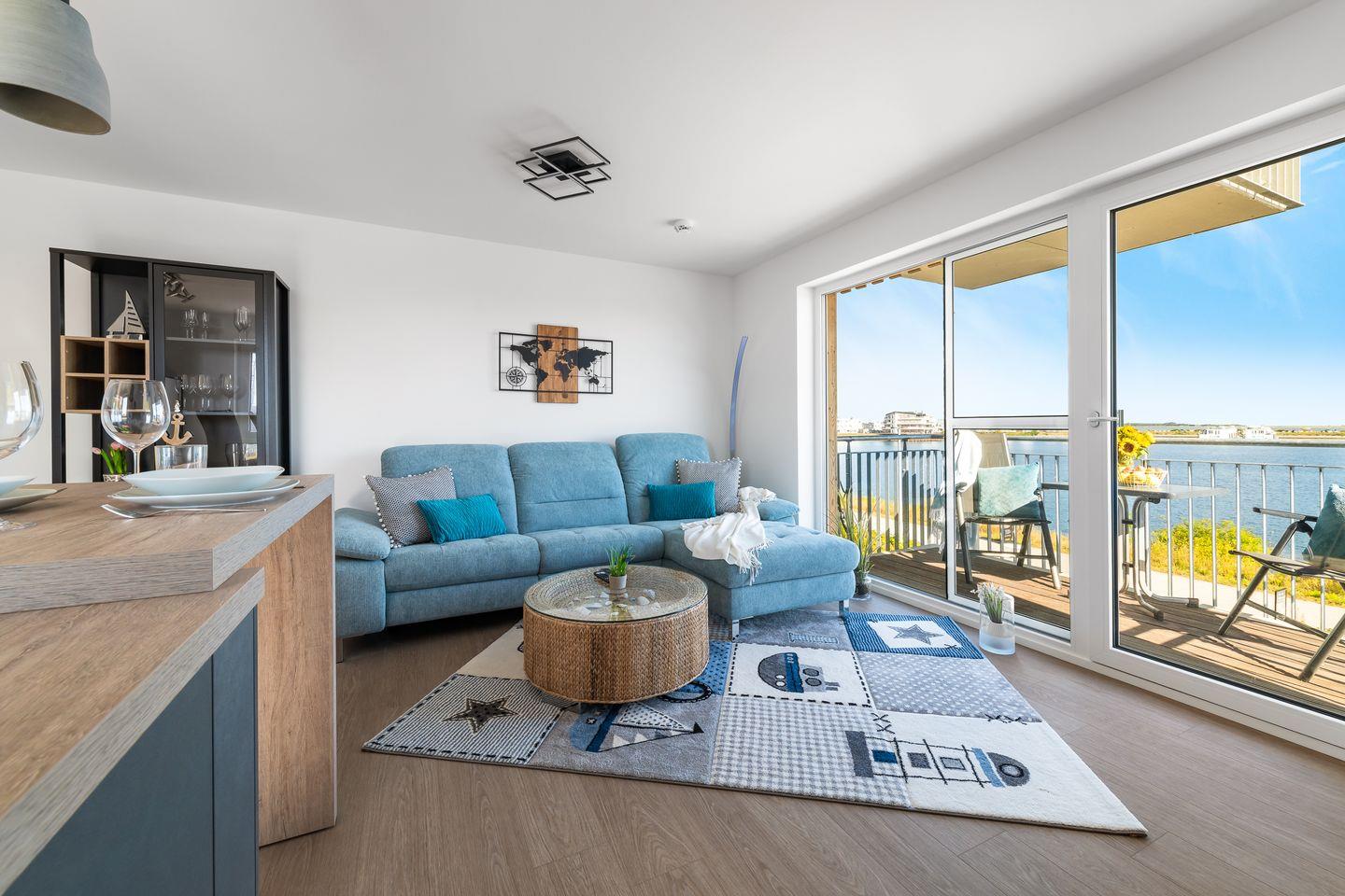 Der helle Wohn- und Essbereich mit integrierter Küchenzeile eignet sich hervorragend für gemeinsame Kochabende mit Blick auf das Meer. Die umfassend ausgestattete Küche erfüllt hohe Ansprüche. Ein besonderes Merkmal der Santiano Flat ist der weitläufige Balkon mit direktem Blick auf den Hafen. Von dort aus können Gäste den Ausblick auf die vorbeifahrenden Segelschiffe genießen.